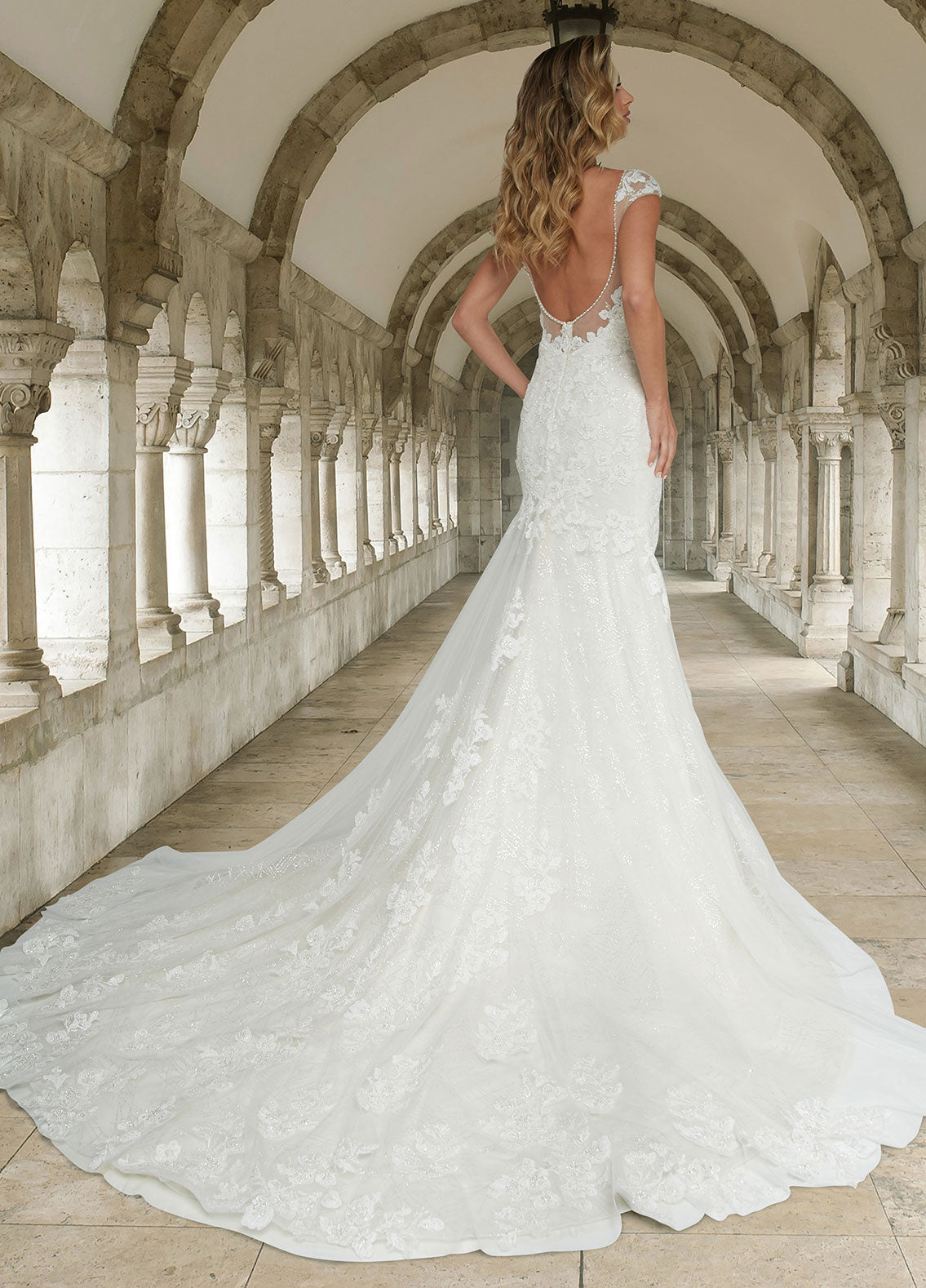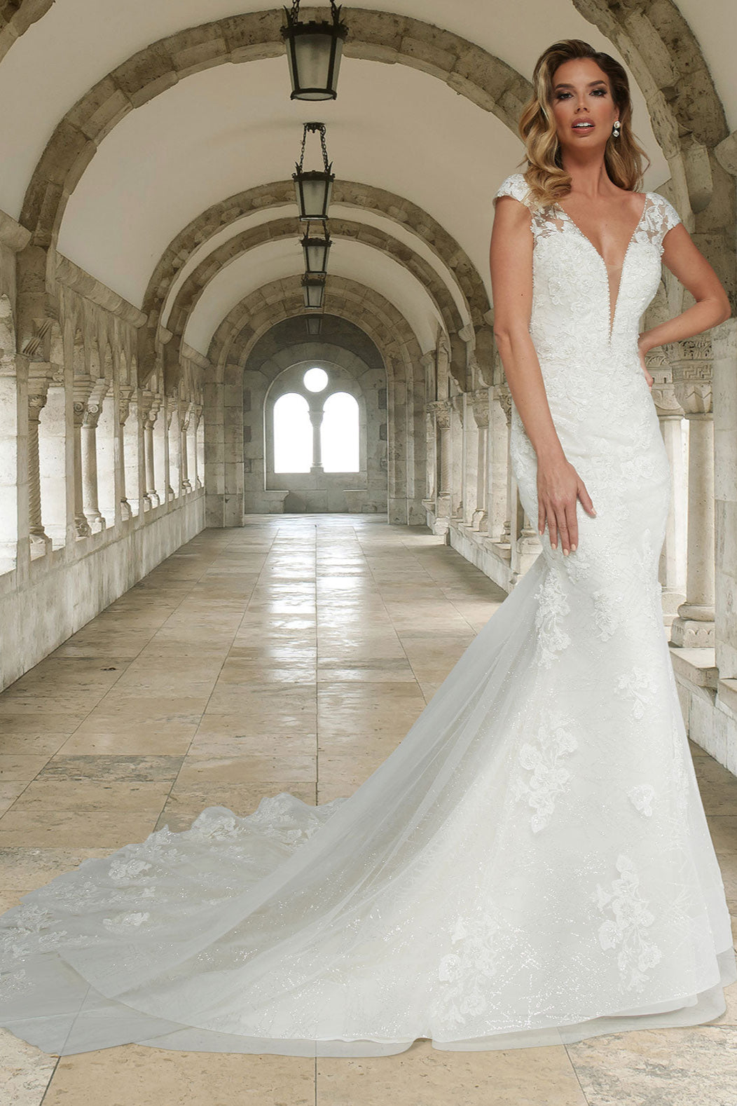 A luminous statement piece. This fitted gown shimmers with allover lace and glitter, finished with delicate beaded details along the cap sleeves. Designed to catch the light beautifully, it’s the perfect blend of sparkle and elegance.