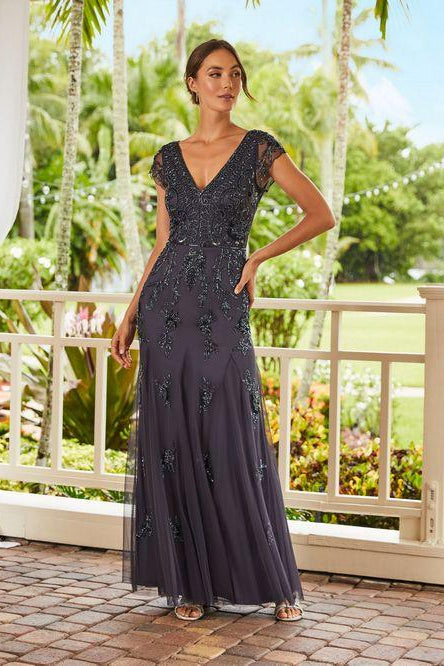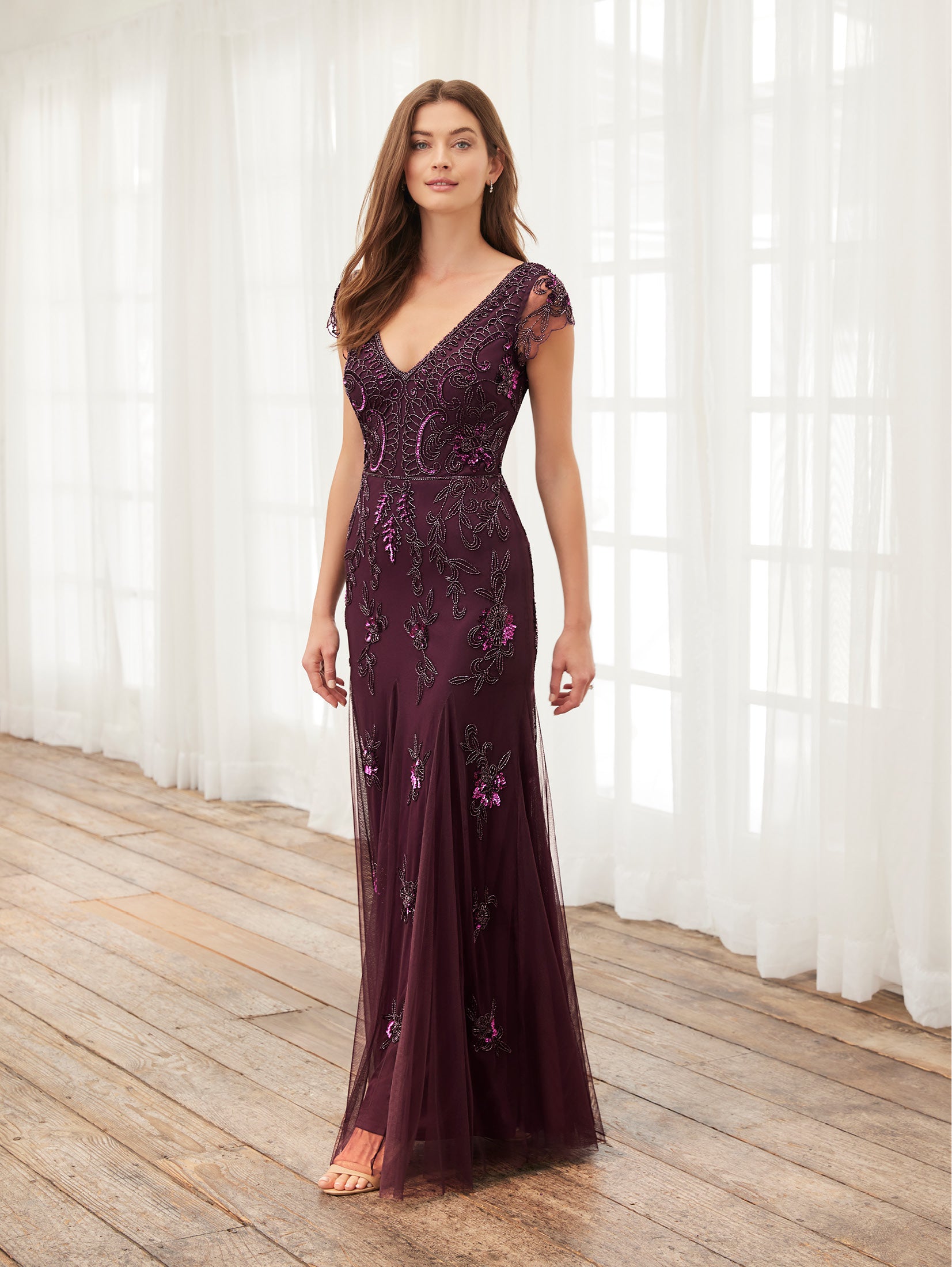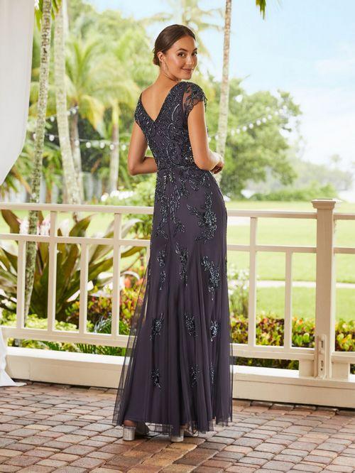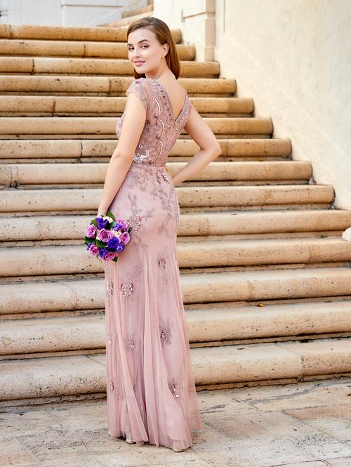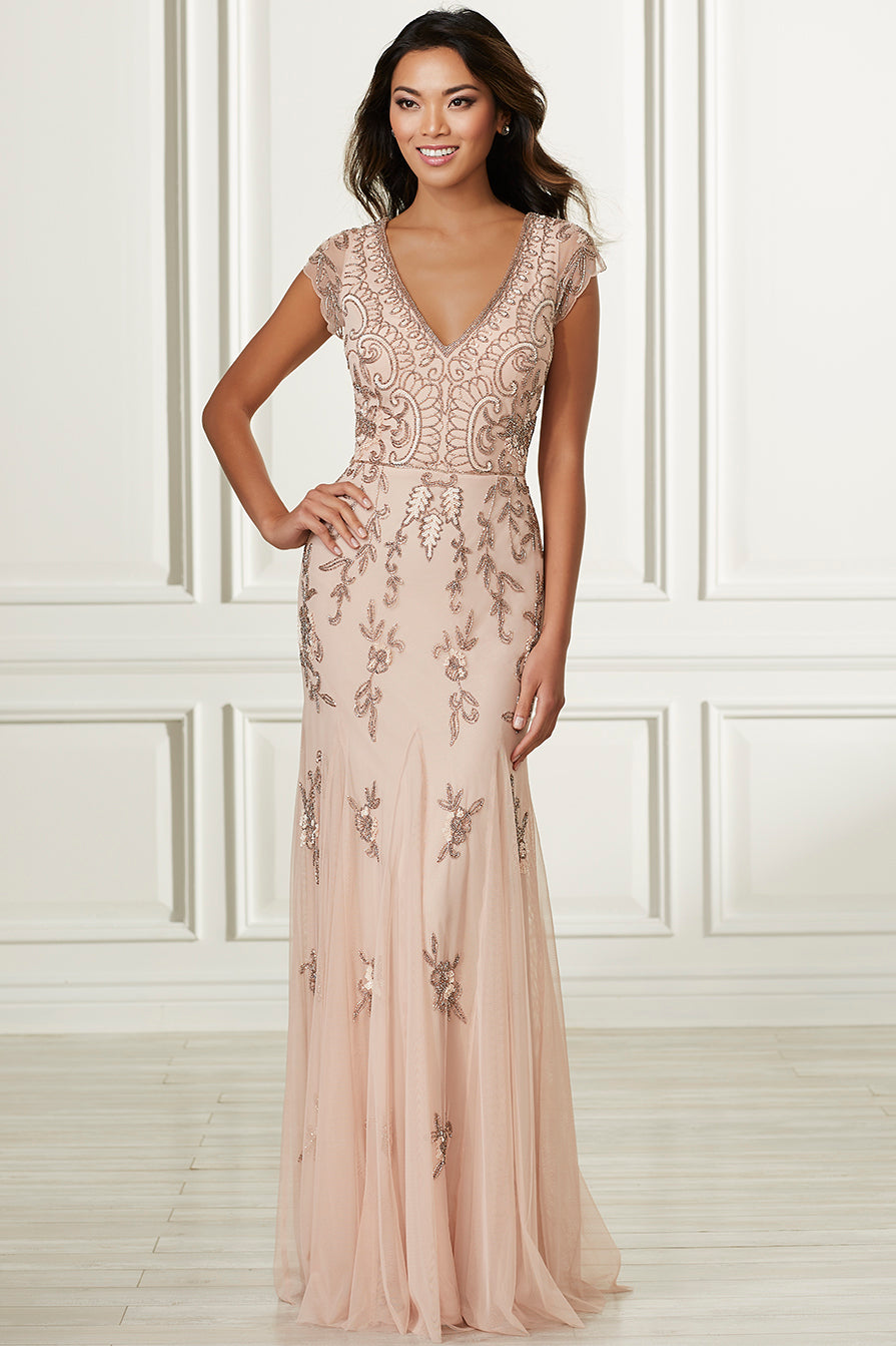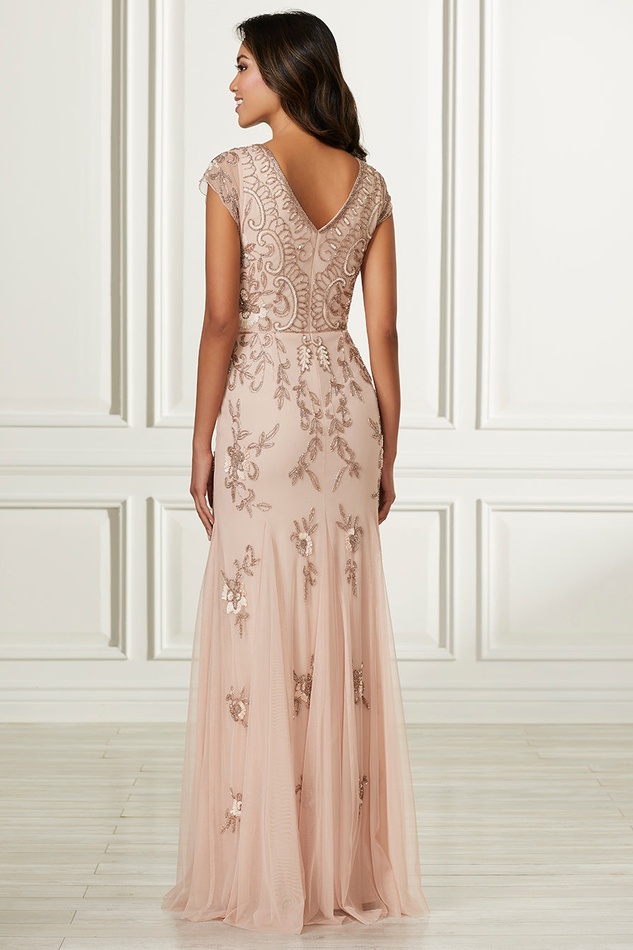 This V neckline, all over beaded gown, features a sheer cap sleeve detail. Thin rows of beading cover the waist seam. The skirt features soft godets. Very lightweight and comfortable.
