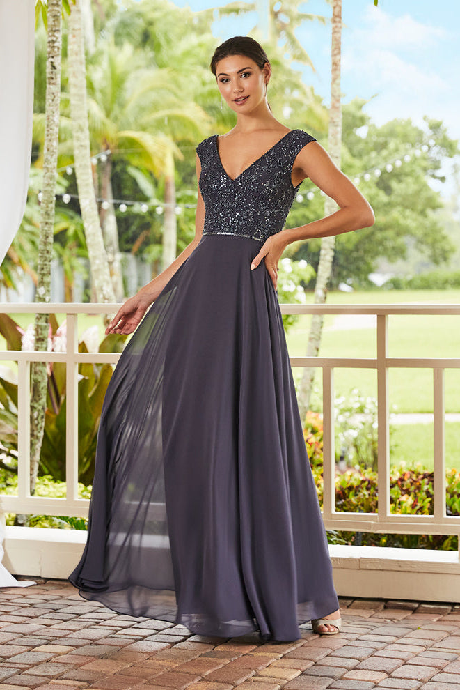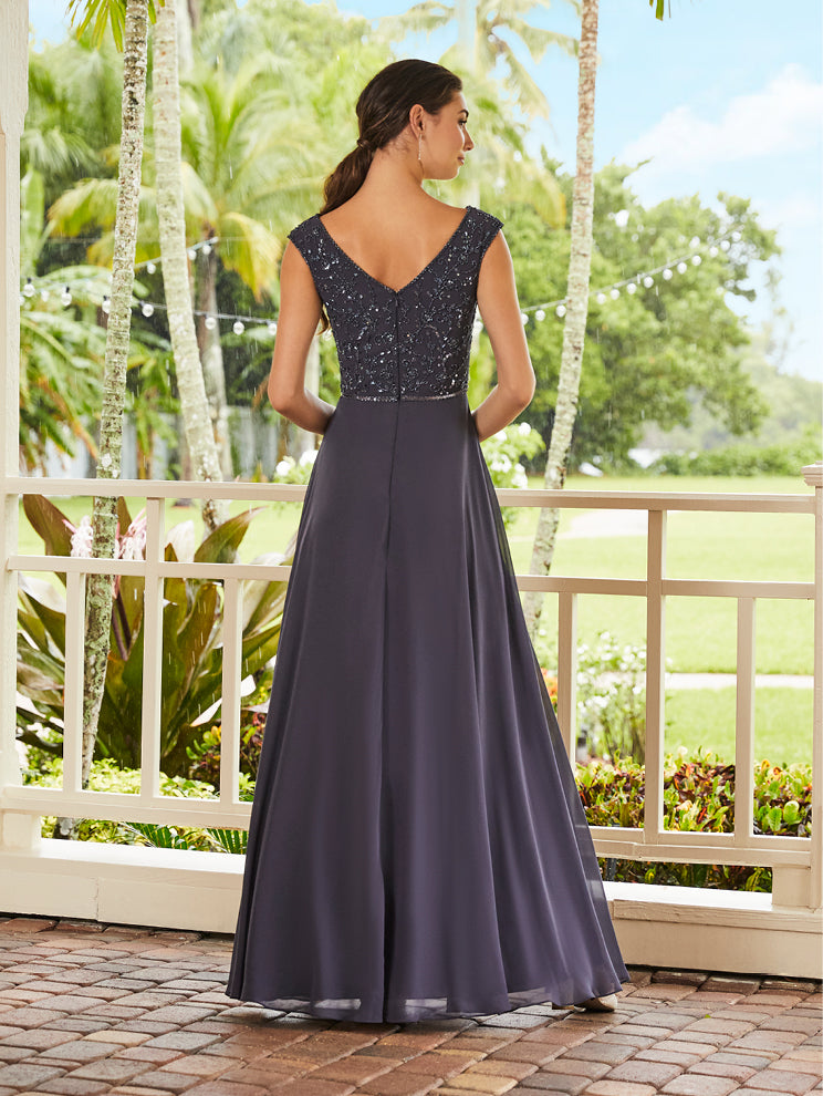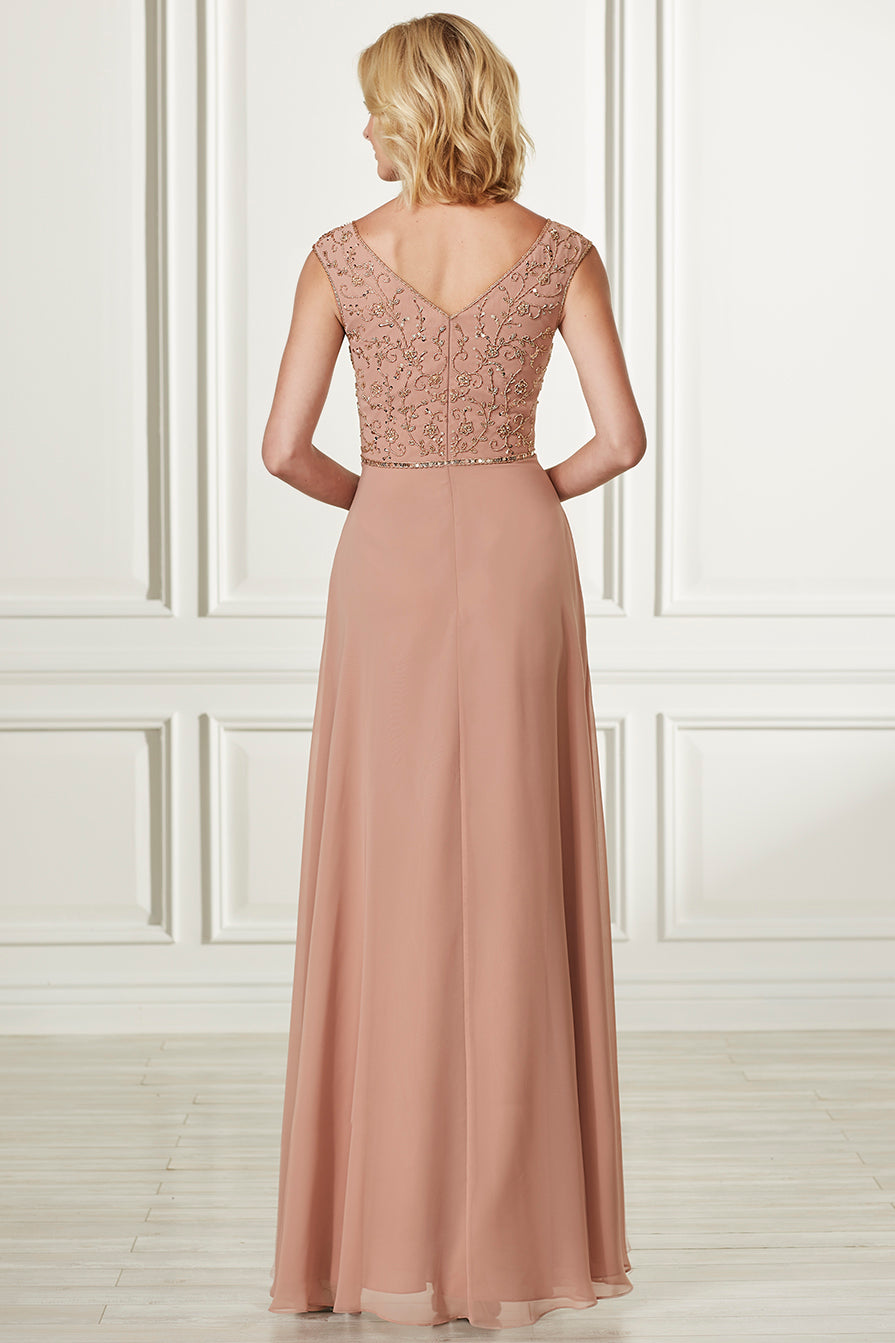 This all over beaded bodice features a wide v front and back neckline. Beading covers the waist seam. The chiffon skirt is semi circle cut.