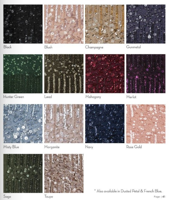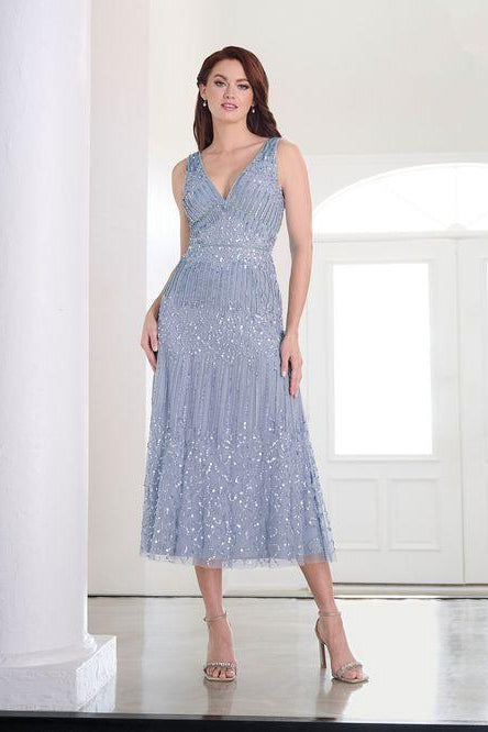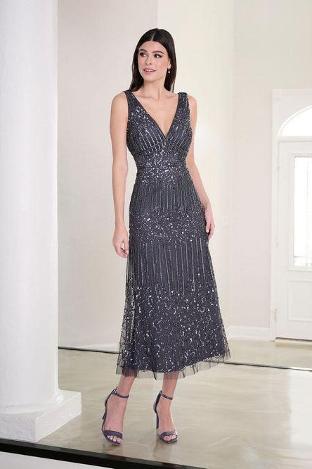 This all-over beaded gown shimmers in banded linear and scattered beading, in an easy to wear, midi length. The bodice features a V-neckline and a wide, flattering waistband. Picture in: Gunmetal, Misty Blue.