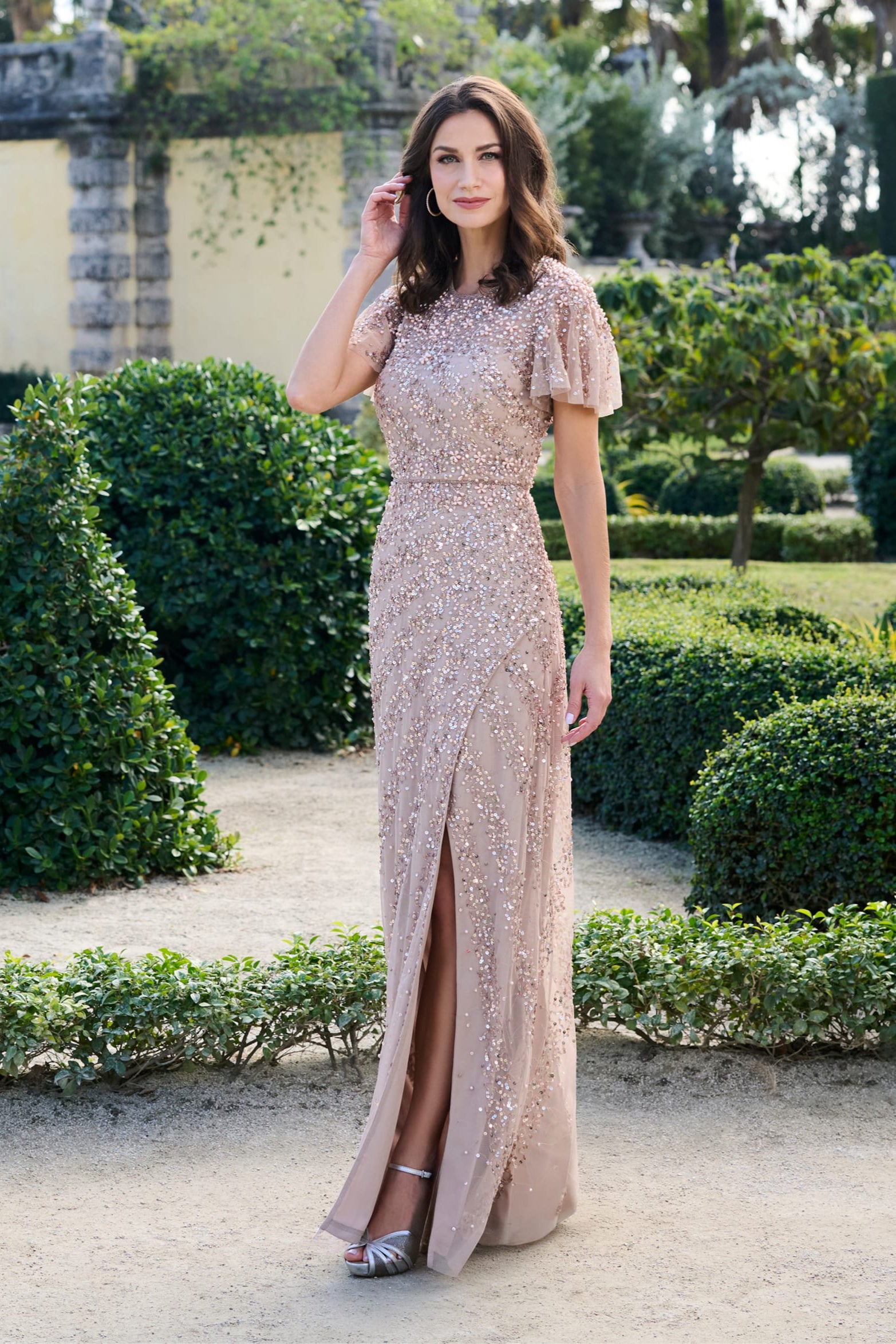 This elegant gown features intricate all-over beadwork that catches the light beautifully. Its delicate flutter sleeves add a soft, romantic touch, while the wrap slit skirt offers a flattering silhouette with a hint of allure. Perfect for making a stylish statement at any special occasion.