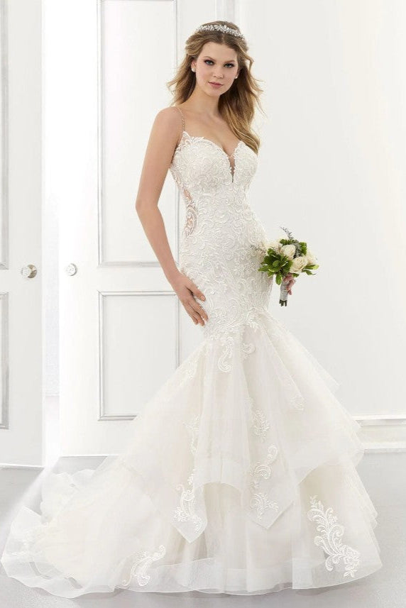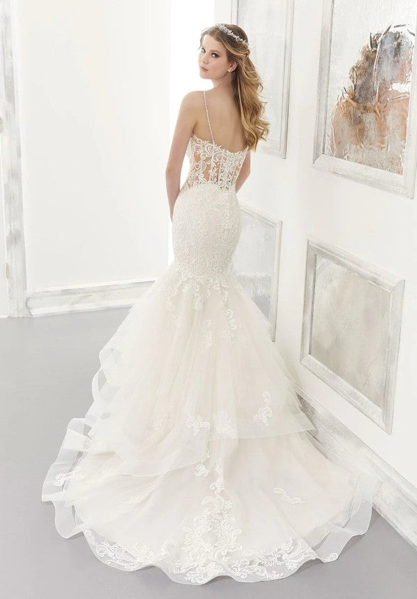 This stunning bridal gown features a dramatic ruffle skirt that cascades elegantly, paired with a flattering mermaid silhouette to accentuate your curves. The sexy back design adds a touch of allure, making it perfect for a bride who wants to combine sophistication with a modern edge. Ideal for making a memorable entrance on your special day.