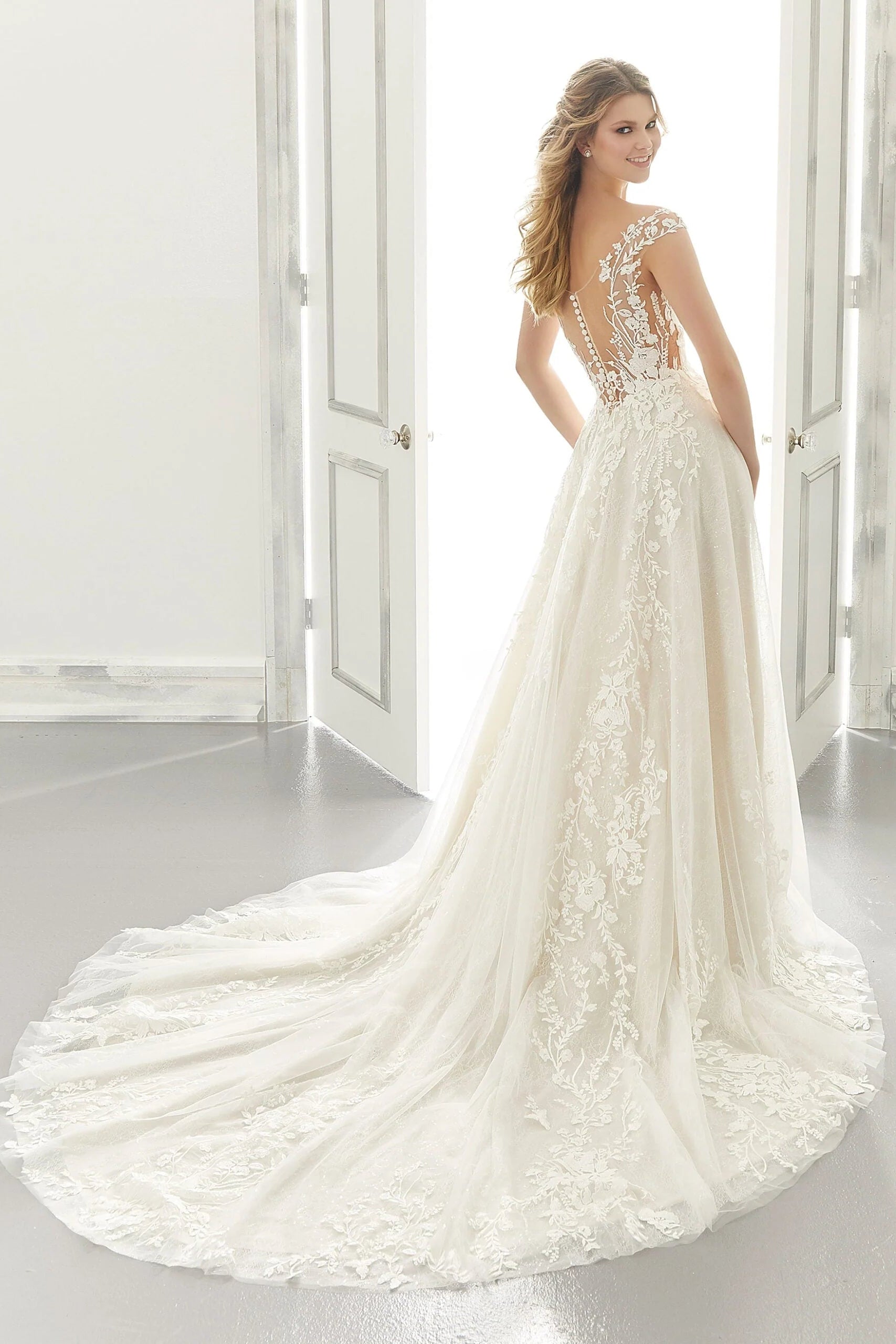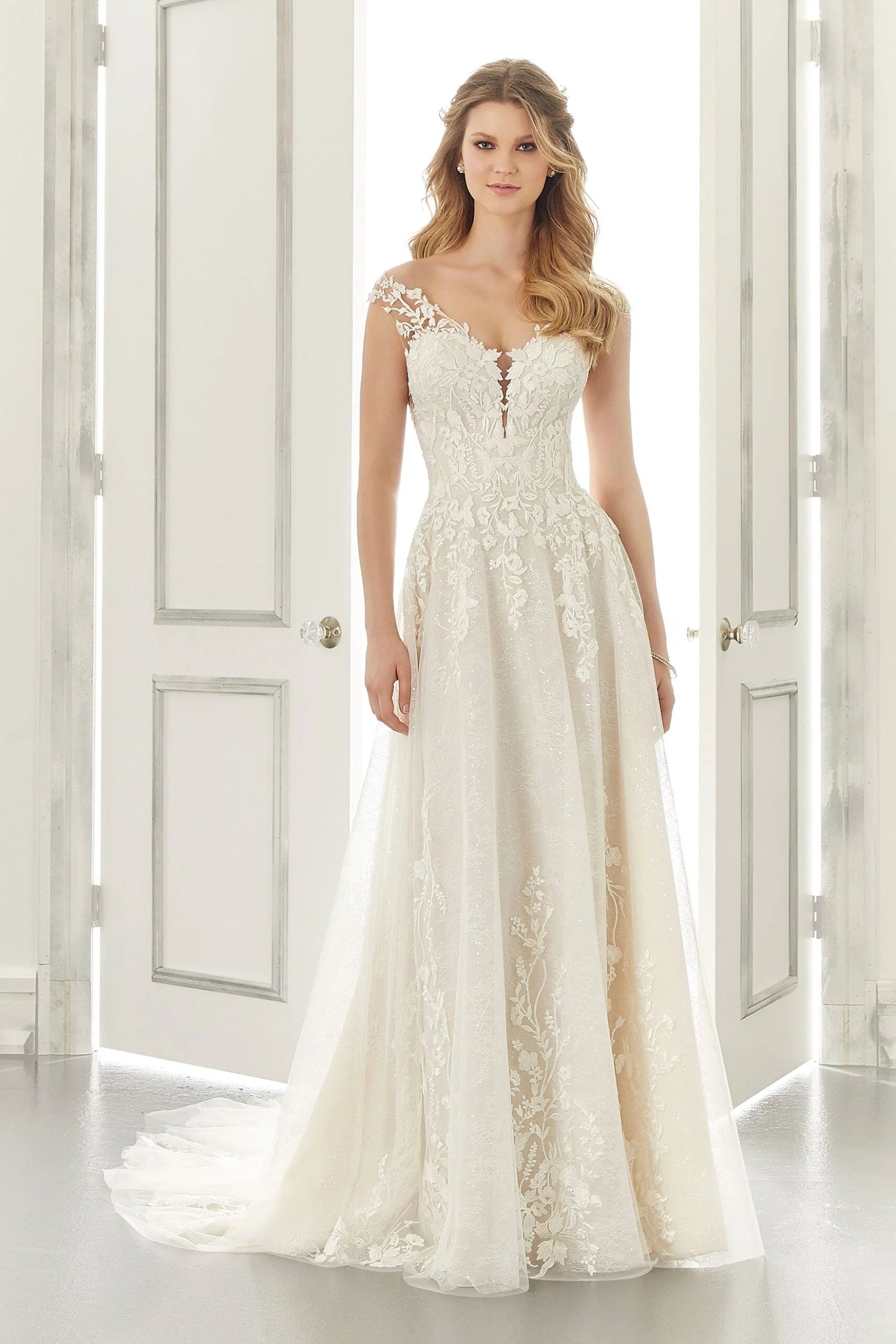 A botanical inspired beauty, the Alice wedding dress features a sheer V-neck bodice accented in frosted embroidery that cascades onto the Tulle over frosted Chantilly Lace A-Line ball gown skirt. An intricate illusion back and wide hemline border complete the look.