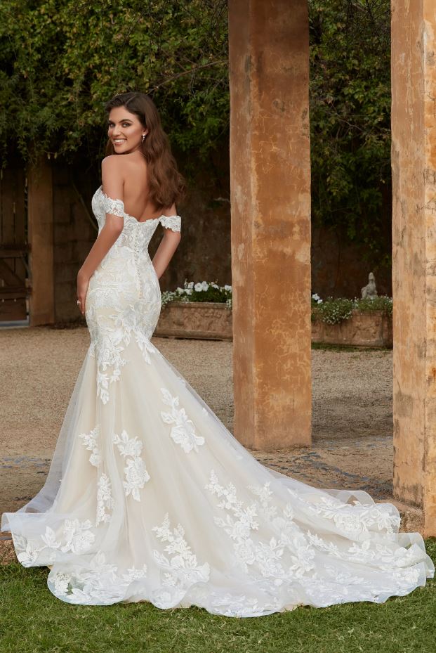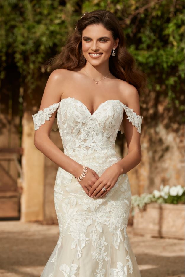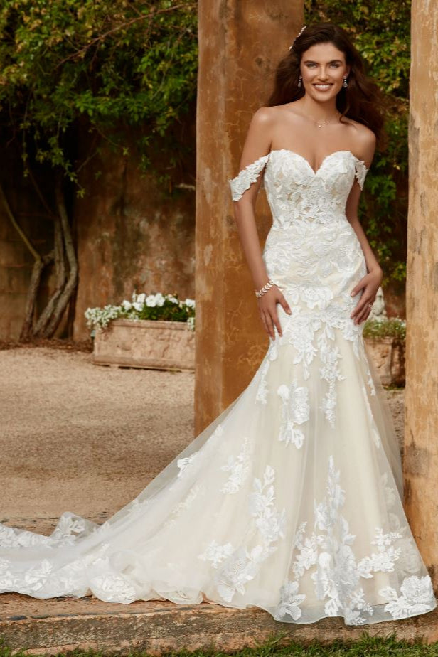 Last one as is! Make your way down the aisle in Amaya, Style Y12245. Designed with style in mind, this sexy off-the-shoulder mermaid wedding dress features statement-making sequined floral lace, misty tulle and glitter tulle for a hint of sparkle. The sweetheart neckline extends into darling off-the-shoulder straps that are detachable so you can have two looks on your special day. Floral appliqués float delicately onto the skirt, flaring just below the hips into a dramatic chapel length train finished with horsehair trim for soft structure. The bodice zips up beneath fabric covered buttons to complete the look.