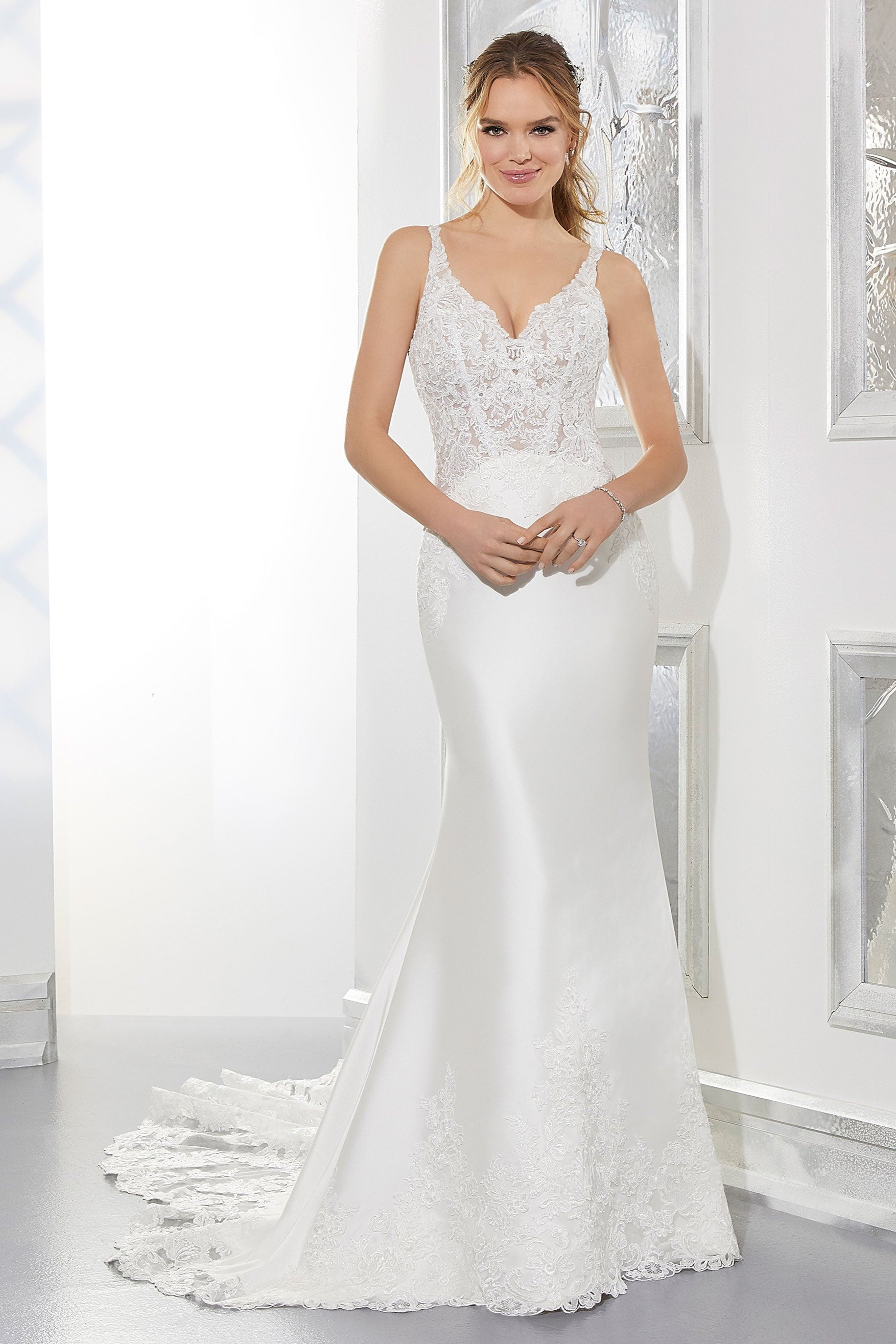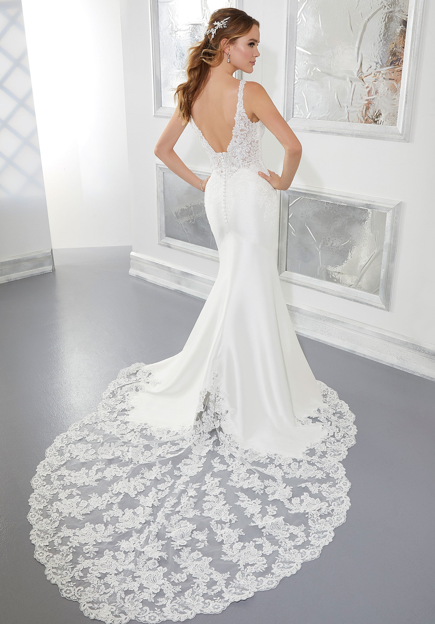 This elegant bridal gown features a fitted silhouette crafted from luxurious satin and delicate lace, creating a timeless and sophisticated look. The detailed train adds a dramatic finish, perfect for making a memorable entrance on your special day. Designed to flatter and captivate, this dress combines classic materials with modern style for a truly fashionable statement.