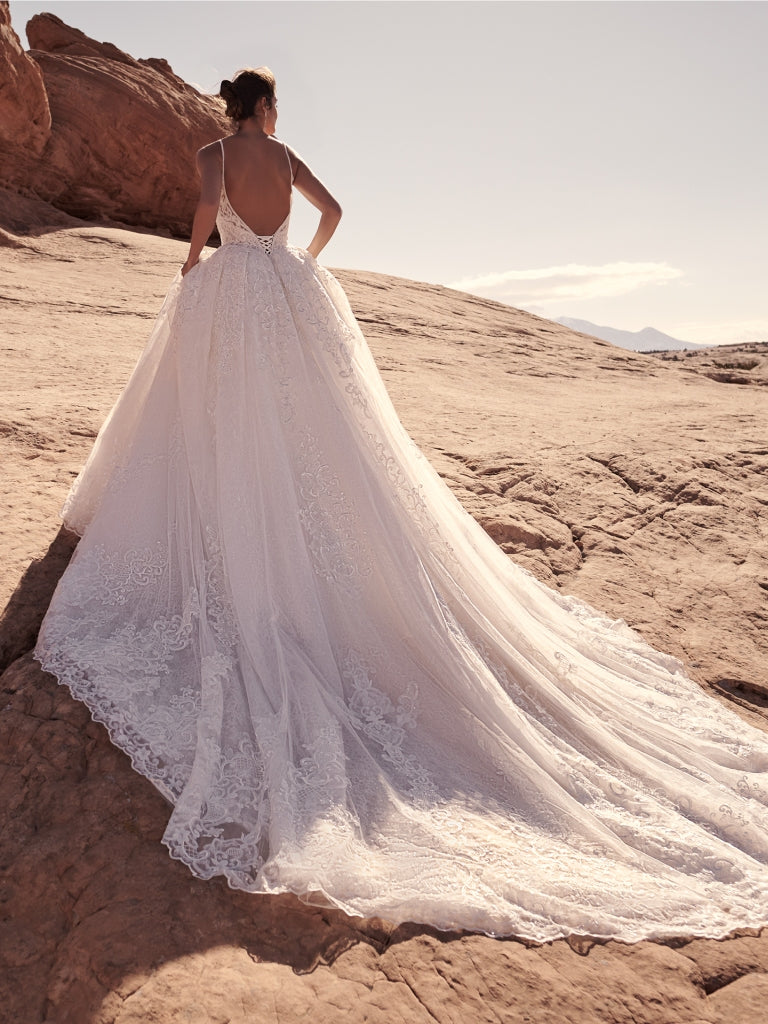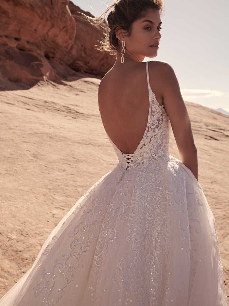 The Blaire gown features exquisite beaded lace motifs layered over delicate Chantilly lace, creating a stunning visual texture. Its illusion lace bodice and flattering V-neckline flow seamlessly into a graceful V-back, enhanced by elegant beaded spaghetti straps. Designed for both style and comfort, it includes a zipper with a lace-up closure and a modesty panel for the corset. Photographed in ivory, this dress embodies timeless sophistication with a modern, fashionable edge.