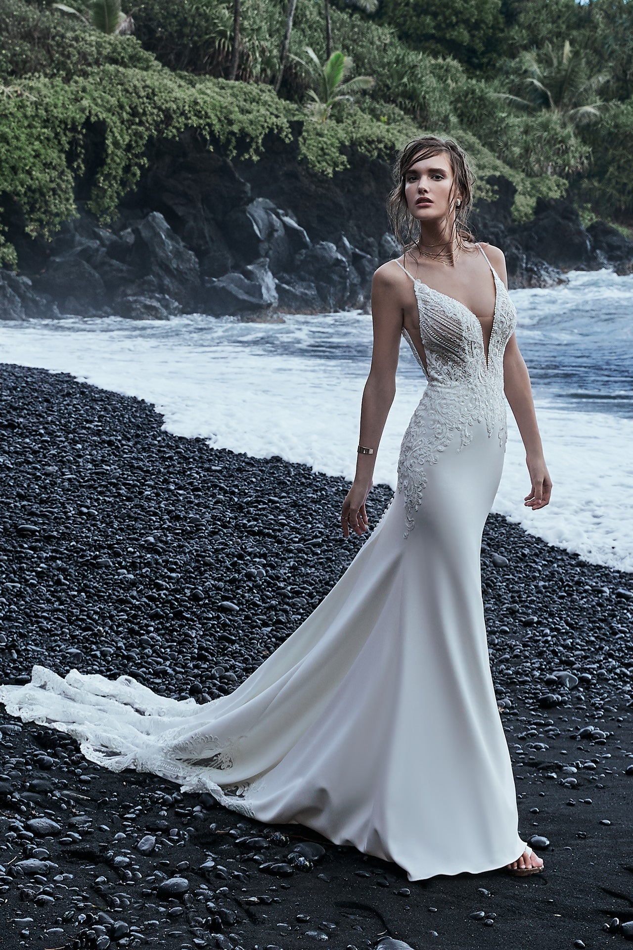 Sophisticated crepe dress with a dazzling bodice, stunning low back, and a dramatic train.