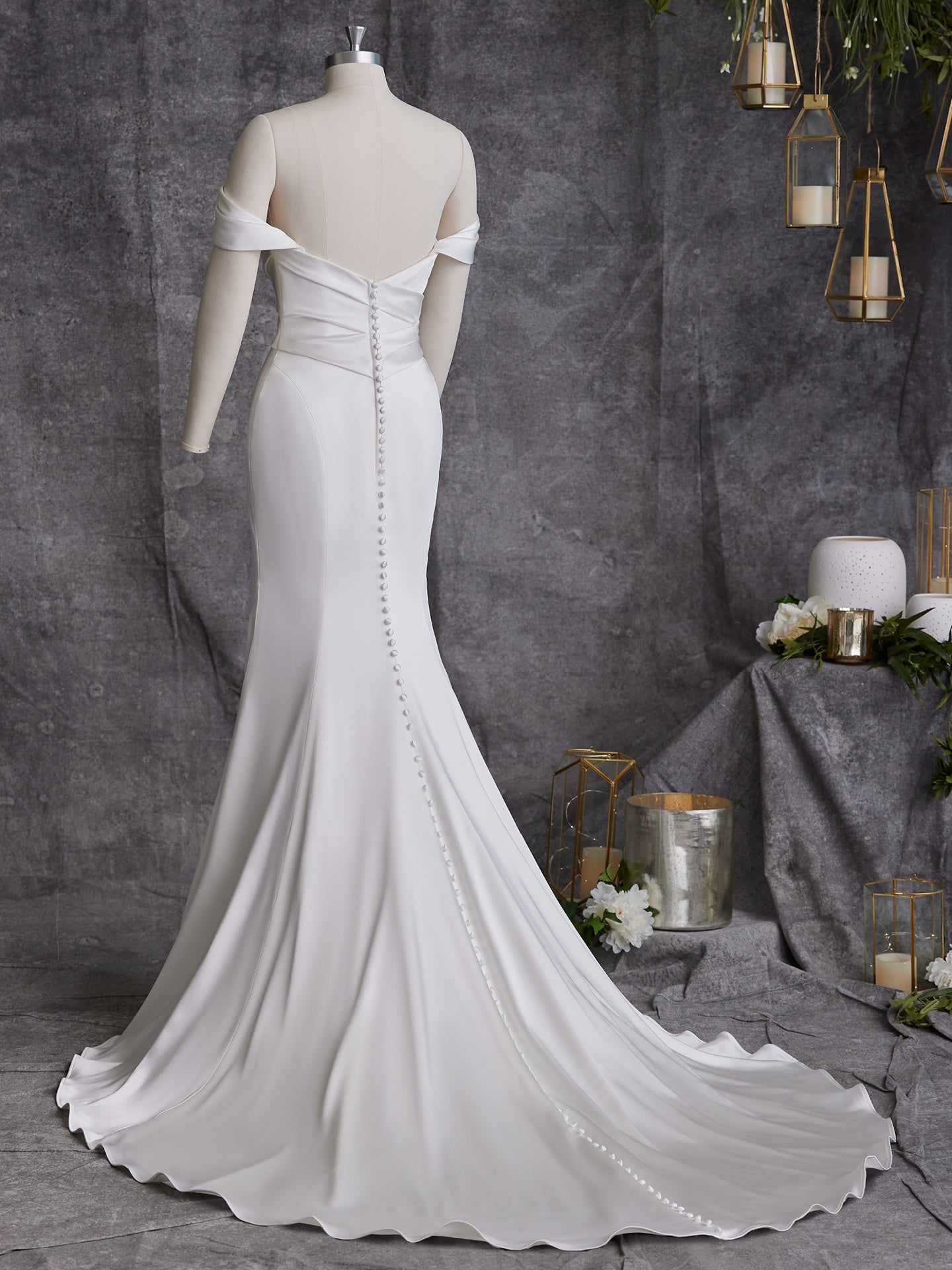 Crafted in luminous Ganavi stretch satin, this off-the-shoulder wedding gown highlights clean lines and fluid drape. The minimalist silhouette celebrates simplicity, while the luxe satin finish creates an understated glow with every movement. A refined choice for the bride who loves sophistication in its purest form.