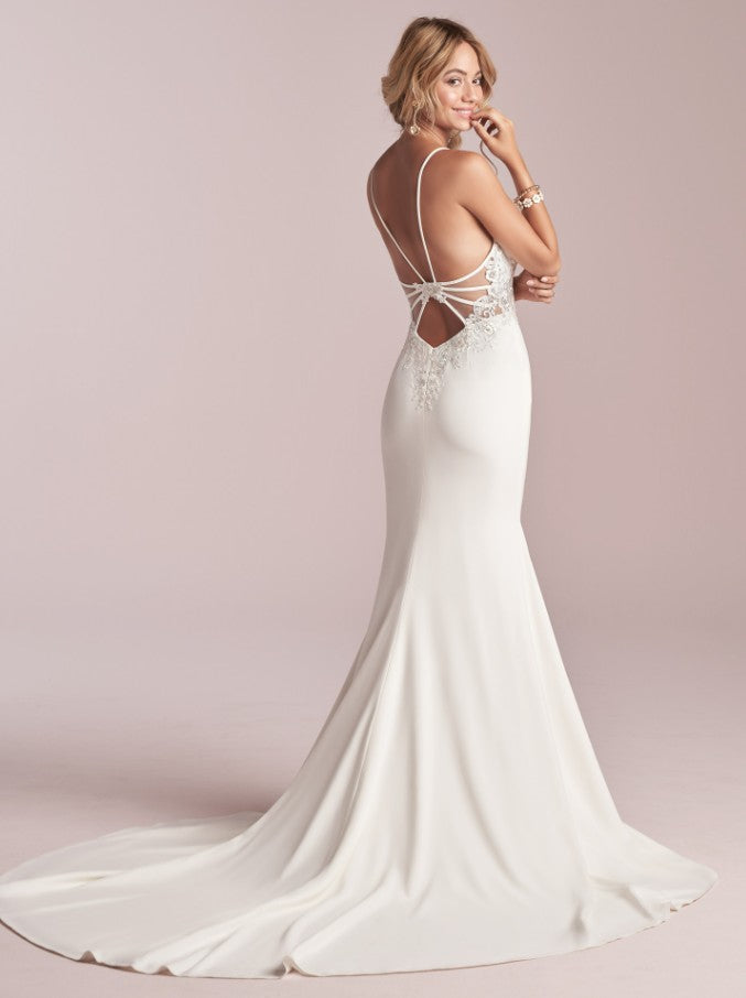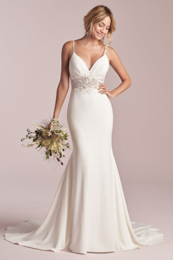 This modern sheath wedding gown, crafted from luxurious crepe fabric, offers a simple yet stunning silhouette. Its clean lines and minimalist design create an effortlessly elegant look, perfect for the contemporary bride seeking understated sophistication on her special day.