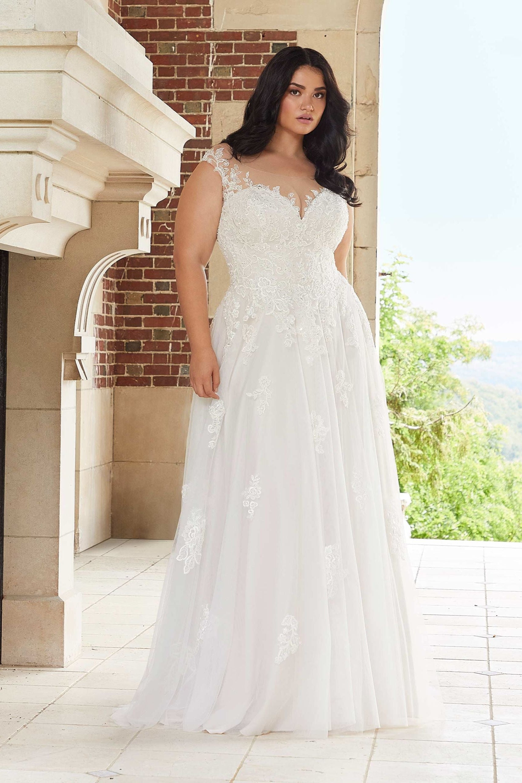 The Elisha - 3351 gown features a graceful illusion neckline crafted from soft tulle, adorned with delicate lace details that enhance its romantic charm. This simple yet elegant design offers a timeless silhouette perfect for brides seeking understated sophistication with a fashionable edge.