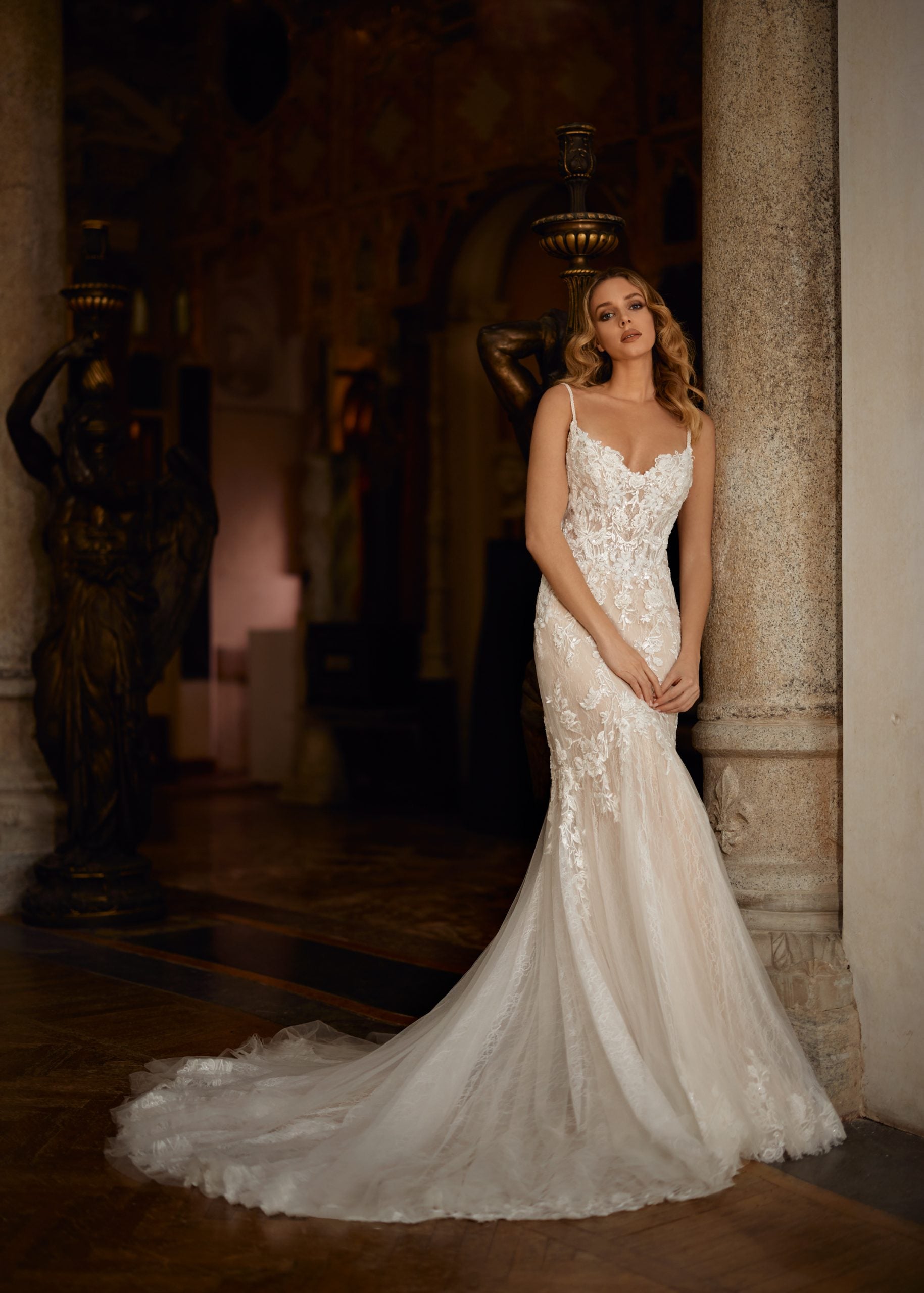 Delicate, refined, and effortlessly chic. The Fawn gown features a fitted silhouette with a beaded bodice that catches the light beautifully. Chantilly underlace adds subtle texture, while beaded spaghetti straps create a graceful, feminine touch. Designed for the bride who wants understated glamour with intricate, modern detailing.
