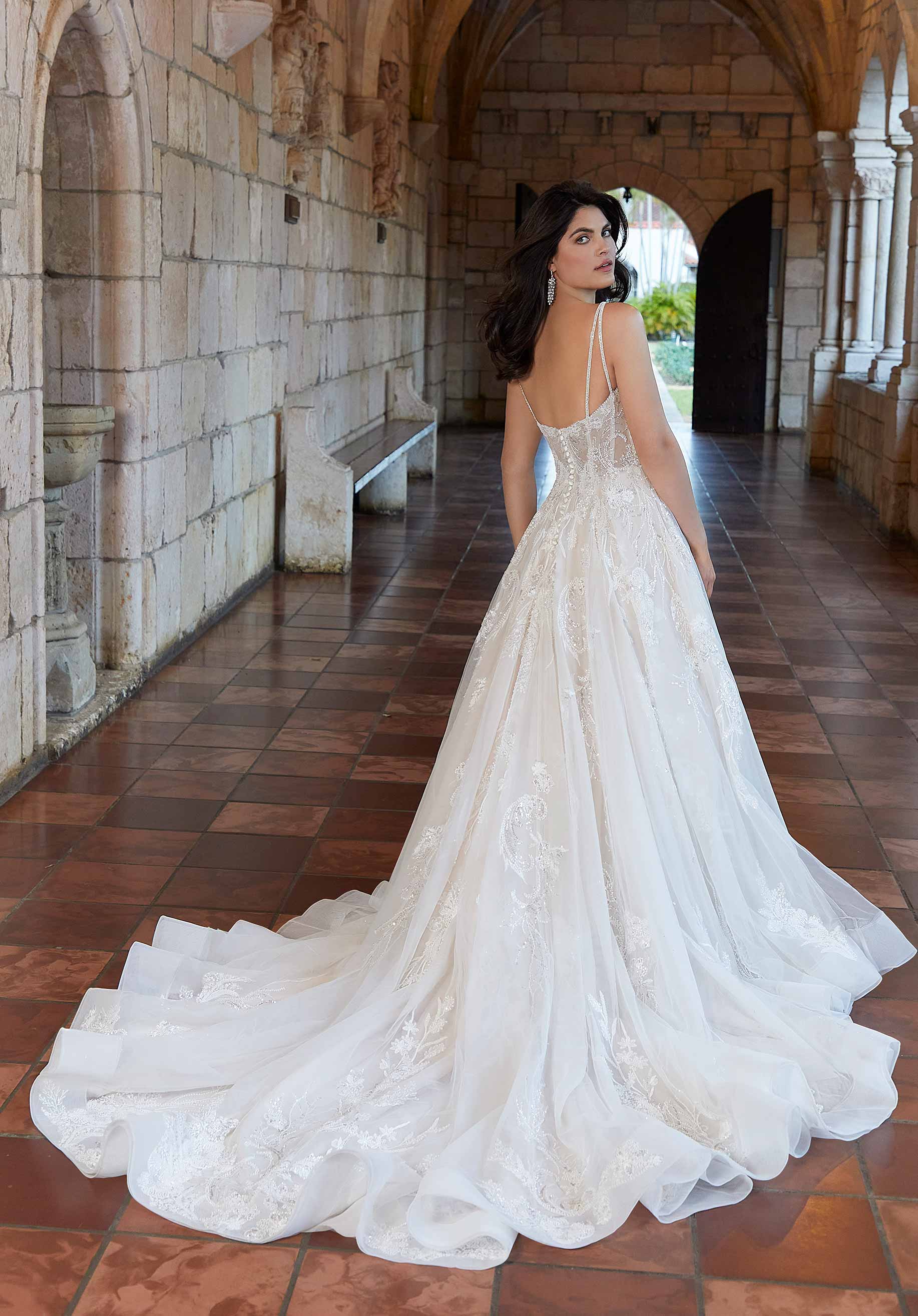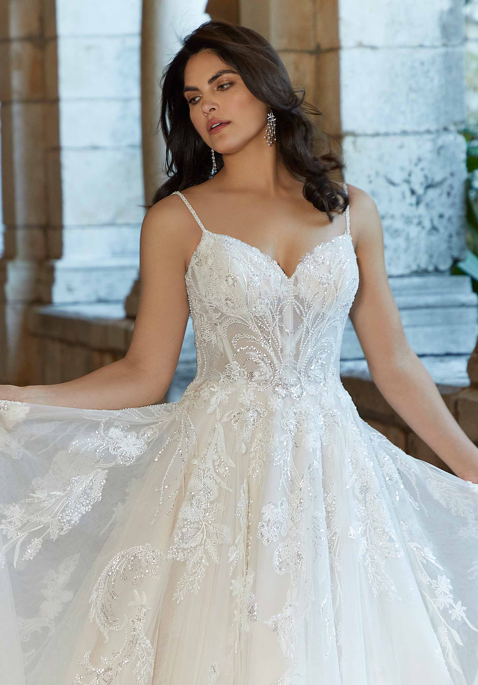 Gabrielle is effortlessly radiant — an A-line gown adorned with patterned sequin lace that catches the light with every movement. Slim spaghetti straps and a flowing train add to the graceful silhouette, creating a look that’s both modern and timeless. She’s the perfect blend of sparkle and sophistication.