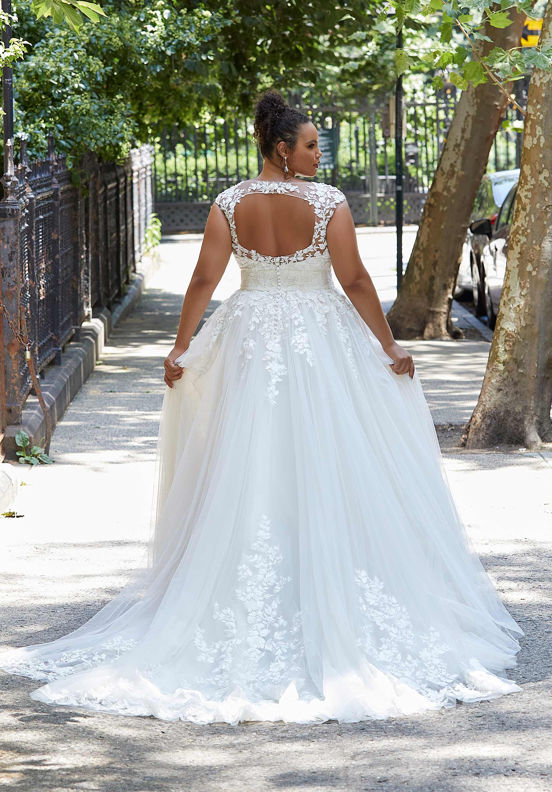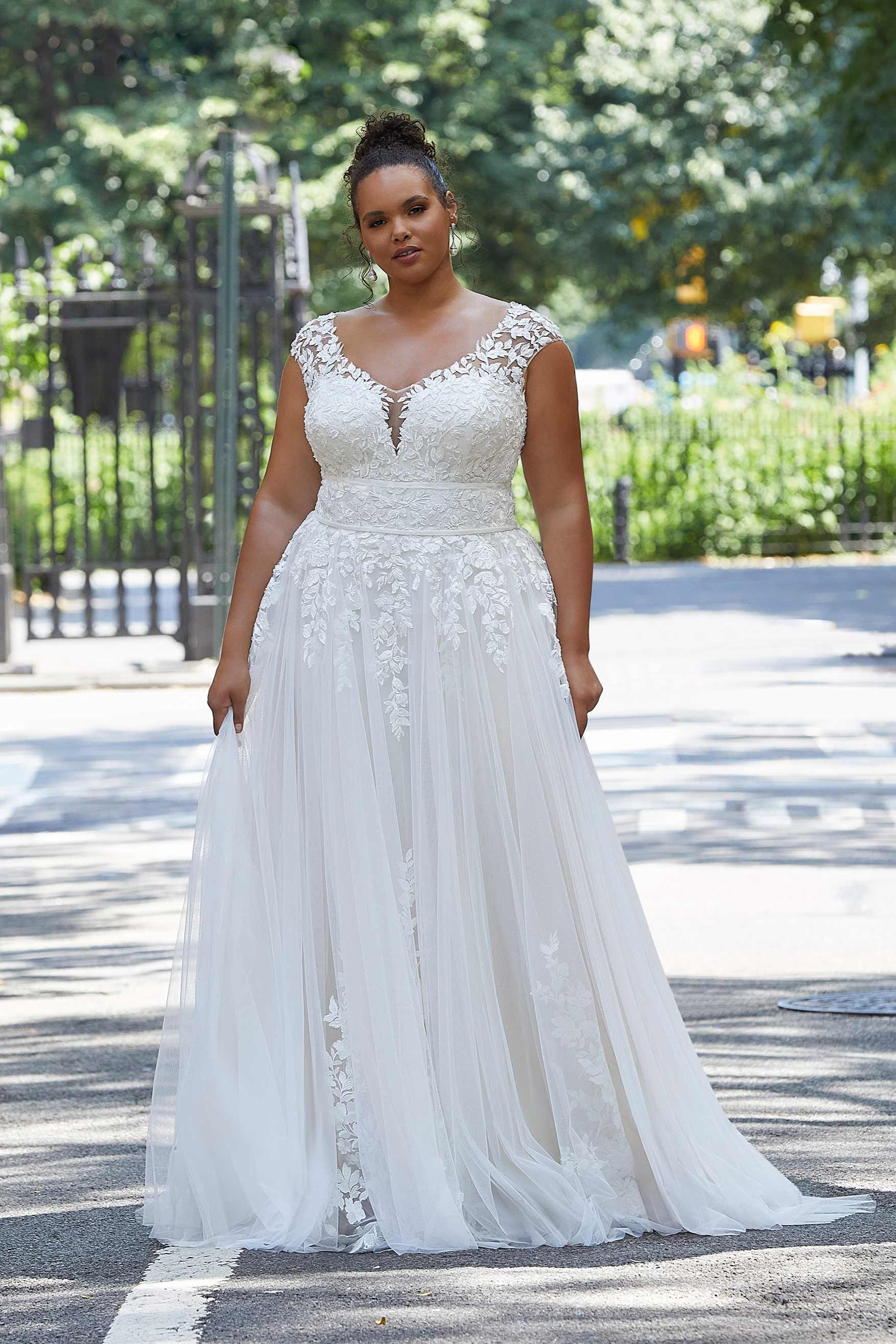 The Hadley - 3375 wedding gown features romantic lace and delicate cap sleeves that beautifully frame the shoulders. Its flattering A-line silhouette offers timeless elegance and a graceful flow, perfect for brides seeking a stylish and romantic look on their special day.