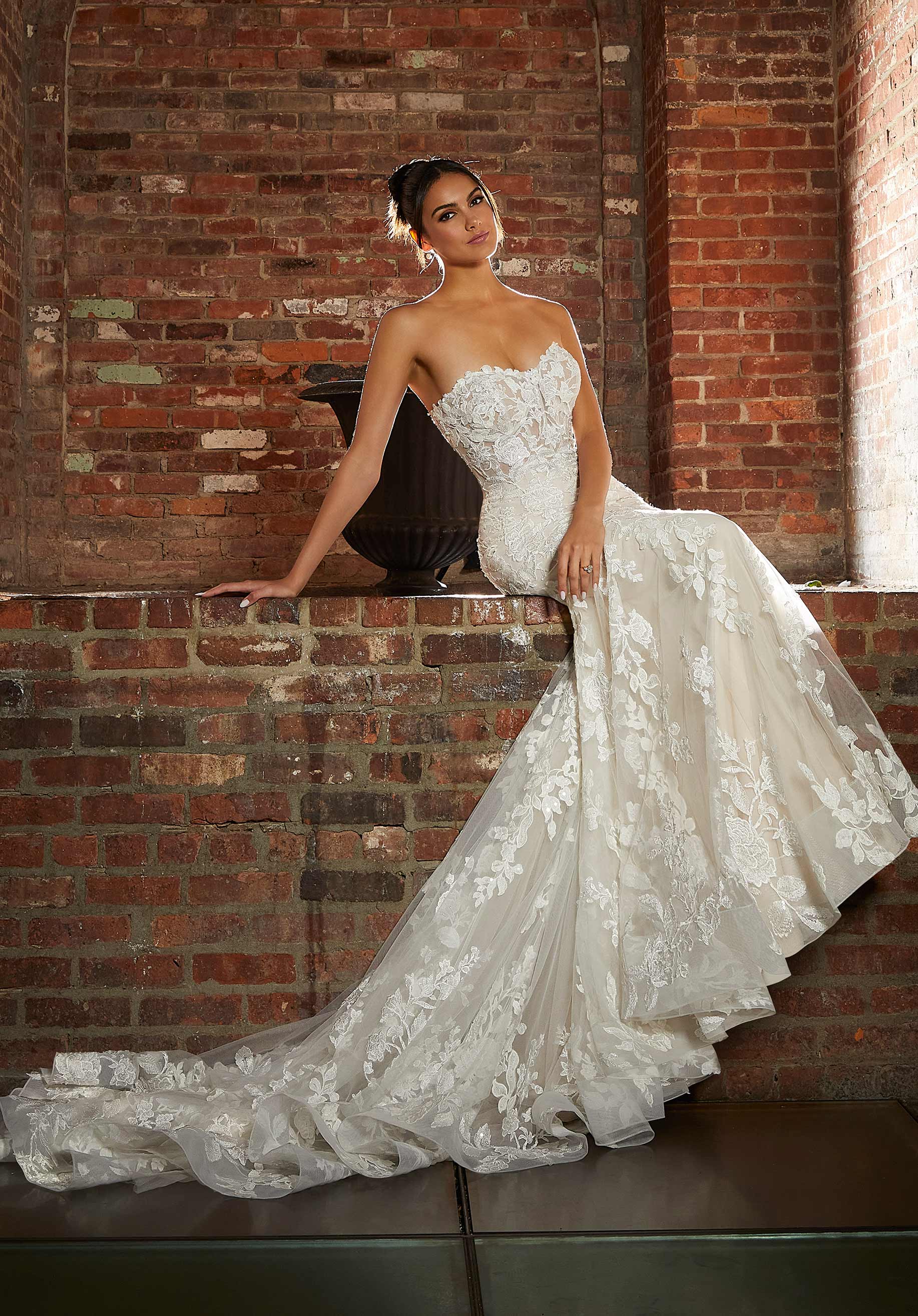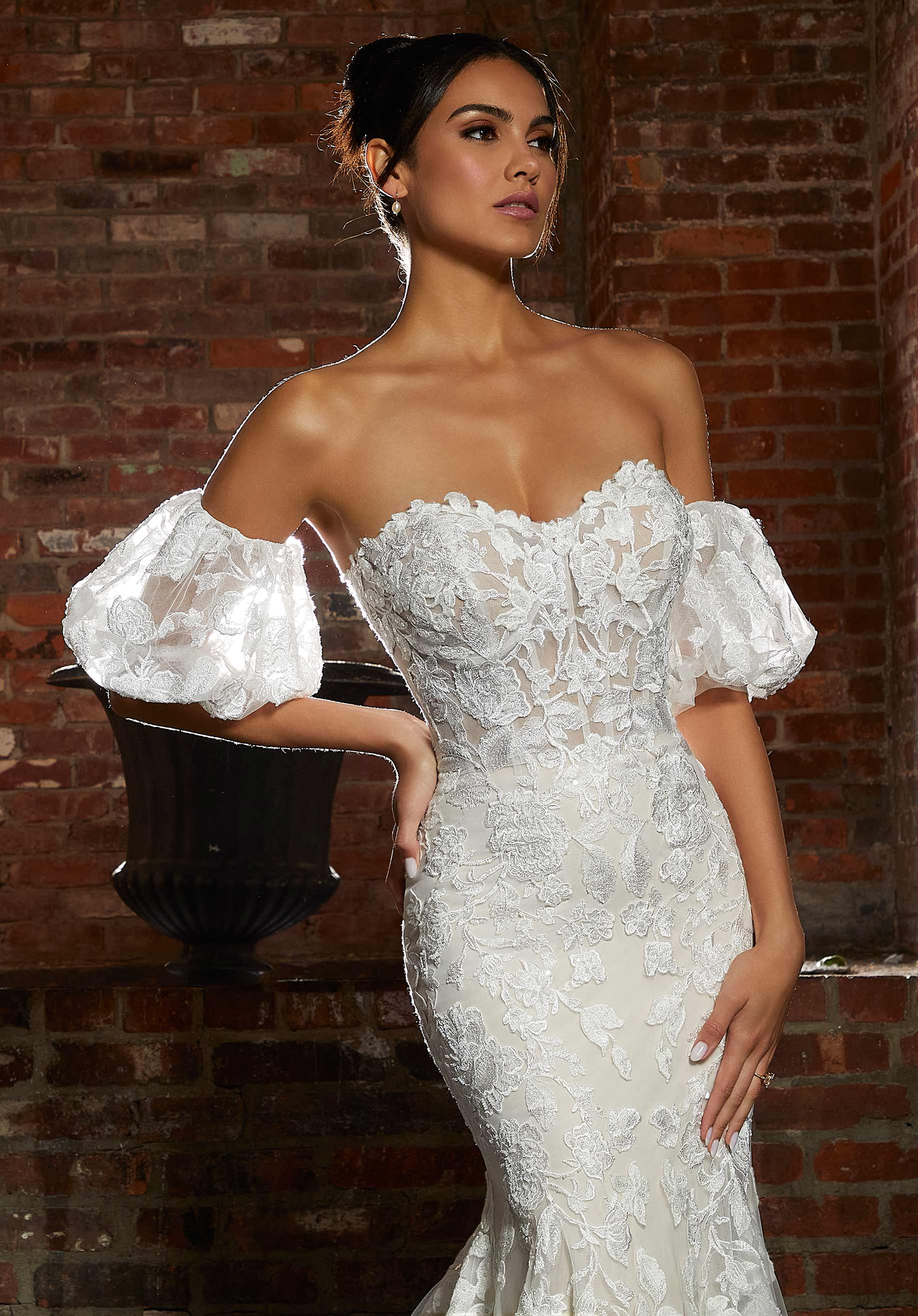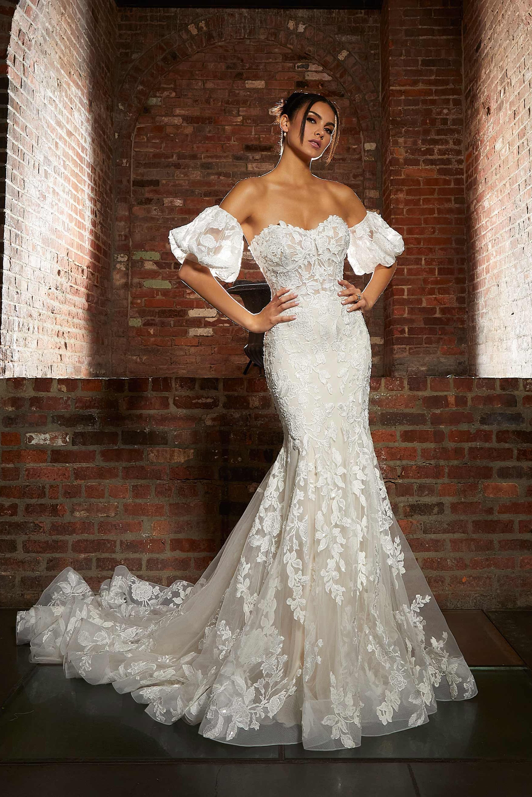 Discontinued - Last one as is! The Hazel gown is a mermaid dress adorned with exquisite floral lace detailing. Its figure-hugging silhouette enhances your natural curves, while the delicate lace adds a touch of romantic elegance. Perfect for brides who want a modern yet timeless look on their wedding day. ***Detachable sleeves included! Veil sold separately***