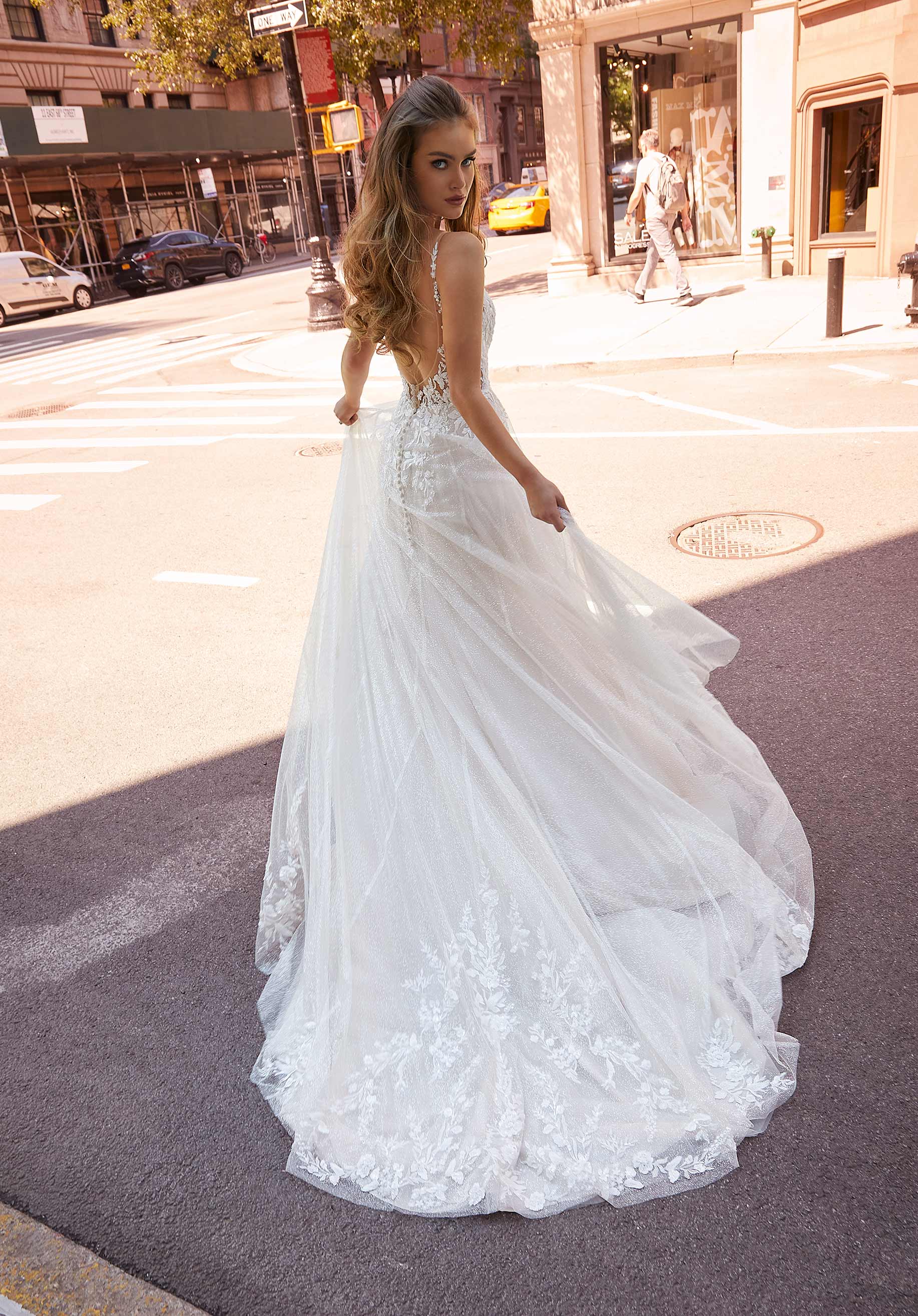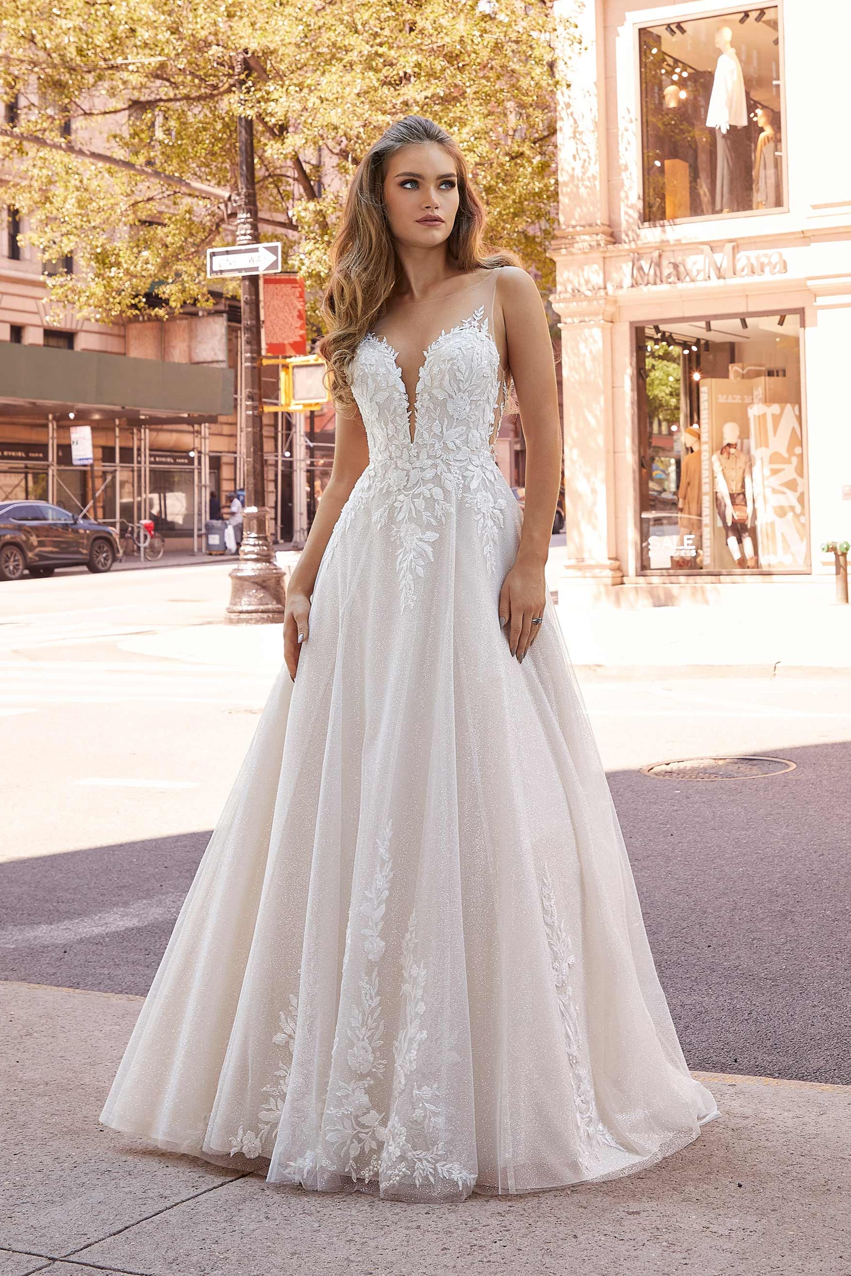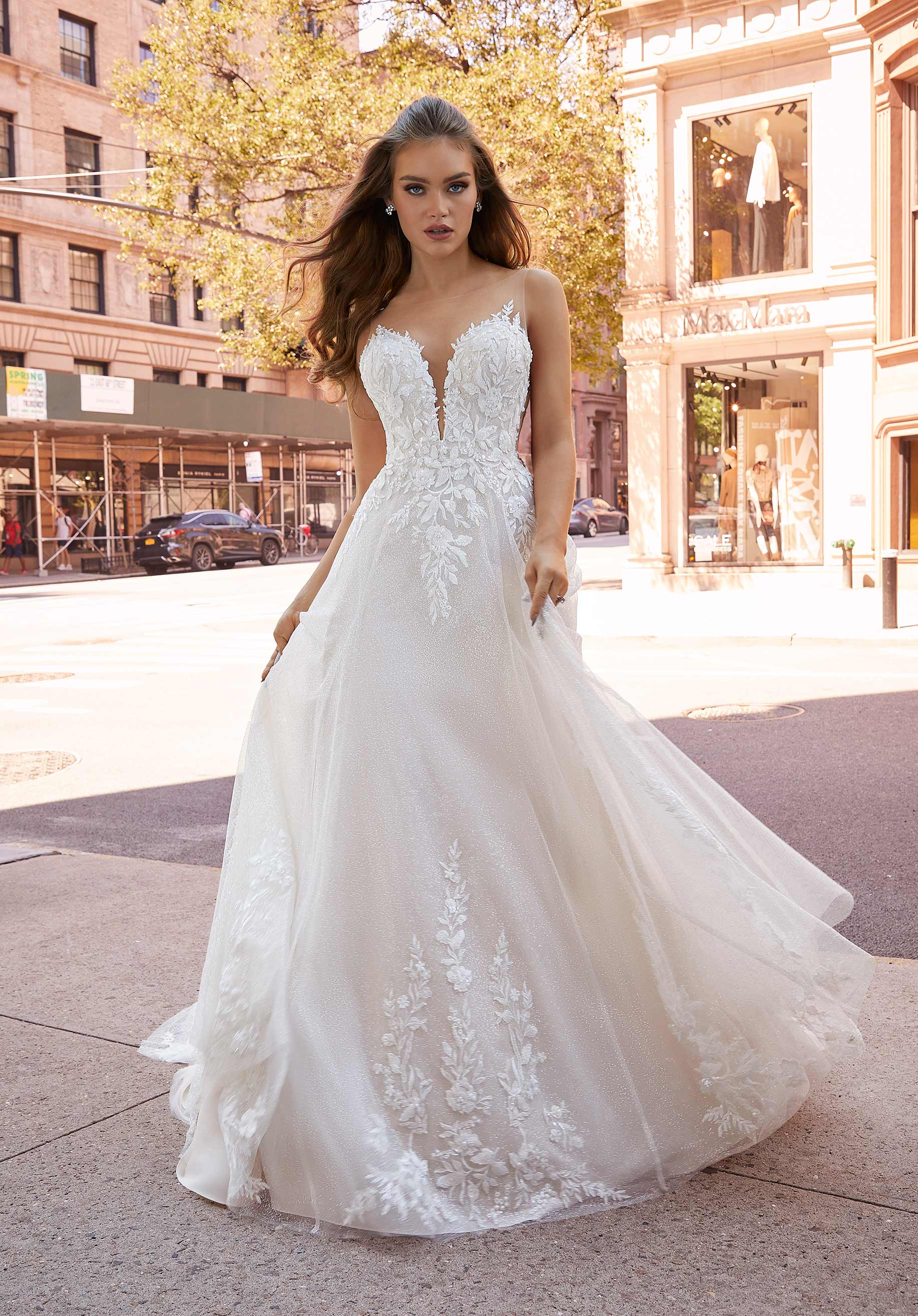 Our Jenny designer wedding dress is an ethereal beauty with delicate crystal beaded, floral lace appliqués decorating the romantic A-line. The illusion fabric allows for a scandalous plunge on the sweetheart bodice, adding a trendy twist to the whimsical gown. The open scoop back adds to the sultry flair and leads to the dreamy train with wide hemline border. Shown in Ivory/Latte/Honey.