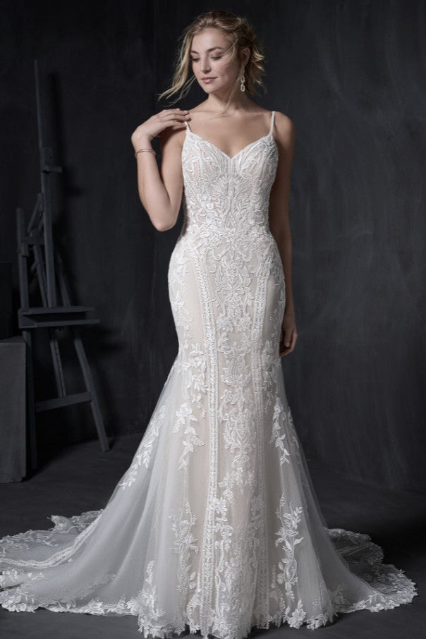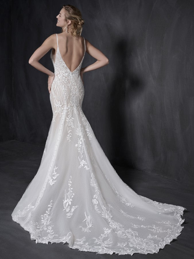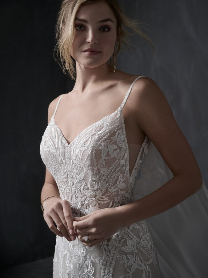 The Liam gown features exquisite sequined lace motifs artfully layered over chic organza and textured tulle, creating a stunning visual effect. Its sheer bodice, lined with organza and textured tulle, offers an illusion at the center front, complemented by a flattering V-neckline and a dramatic deep V-back. Delicate lace spaghetti straps add a touch of elegance, making this dress a perfect choice for a modern, fashion-forward bride.