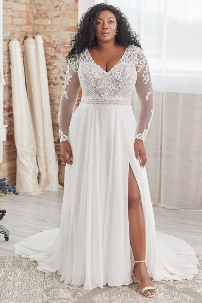 Embrace effortless elegance with the Lorraine Dawn wedding gown. Featuring boho-inspired long sleeves and delicate beading, this dress combines intricate detail with a flowing, airy chiffon skirt. Its simple silhouette highlights refined beauty, perfect for a bride seeking a fashionable and graceful look on her special day.