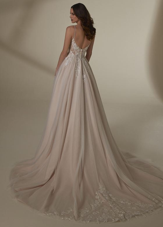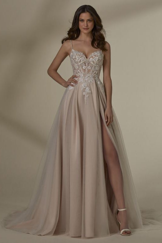 This romantic wedding gown features a flattering A-line silhouette and an illusion bodice that adds a delicate, modern touch. Spaghetti straps enhance its graceful design, creating a timeless look perfect for your special day. Elegant and effortlessly stylish, this dress embodies classic beauty with a contemporary edge.
