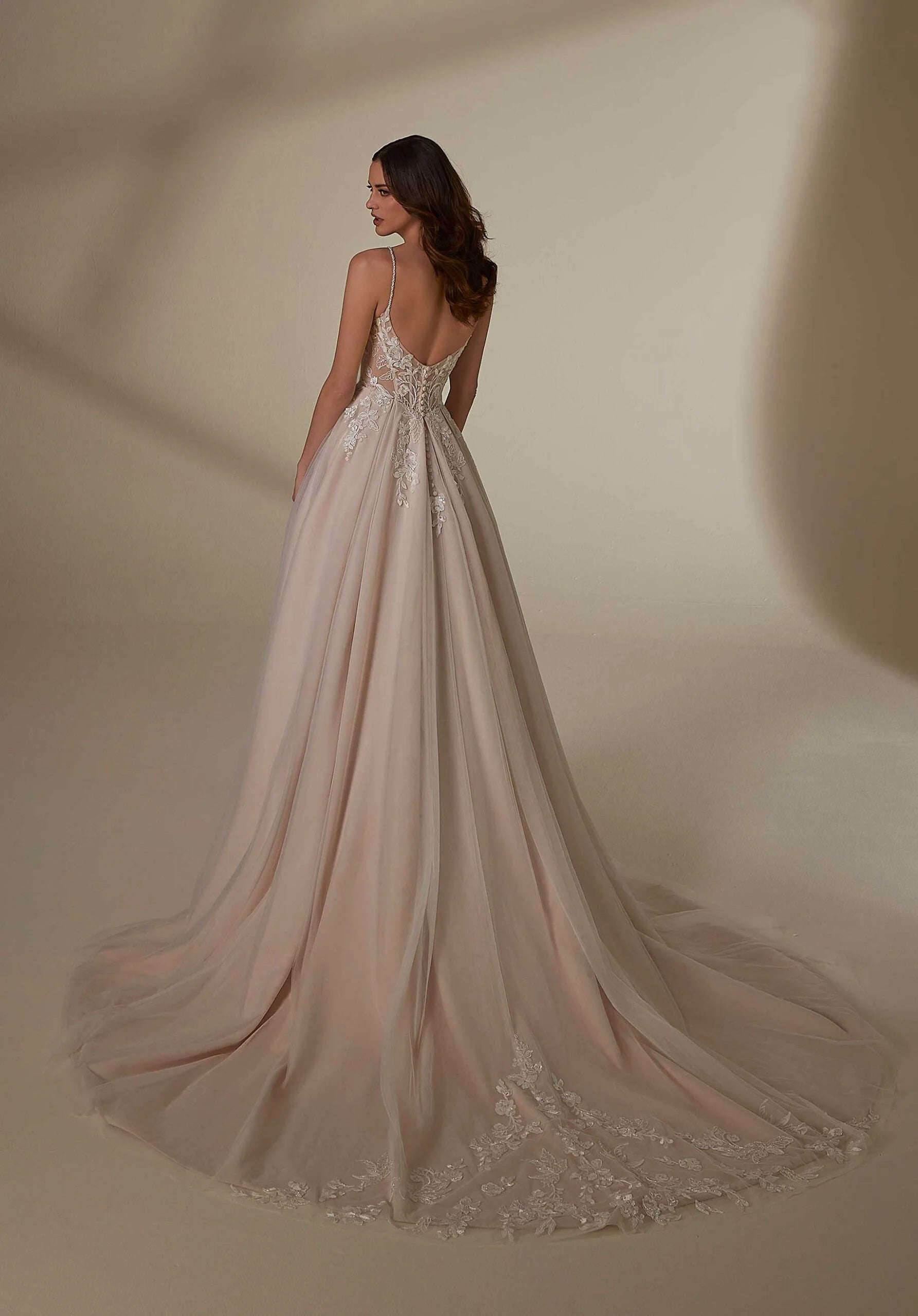 Our Maya designer wedding dress serves effortless glamour, featuring a stunning bustier bodice designed with decadent crystal beaded embroidered lace. The box-pleated tulle skirt floats off the body with a slit for a sultry pop of leg. Shown in Ivory/Champagne/Honey.