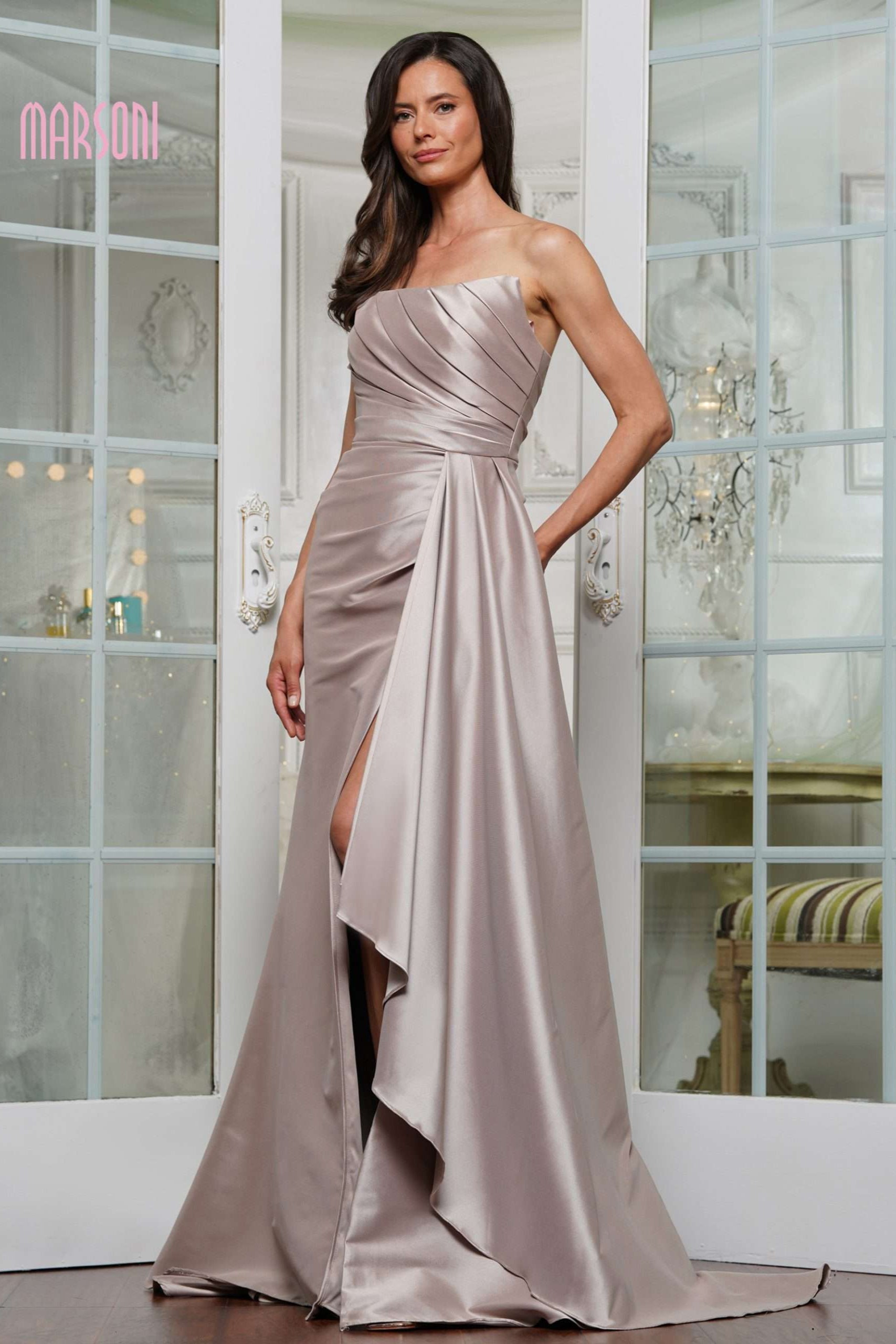 This strapless fit & flare gown is crafted from stretch mikado, offering both comfort and style. The pointy neckline adds a touch of elegance, while the pleated bodice and sash create a flattering silhouette. Perfect for formal events or special occasions.