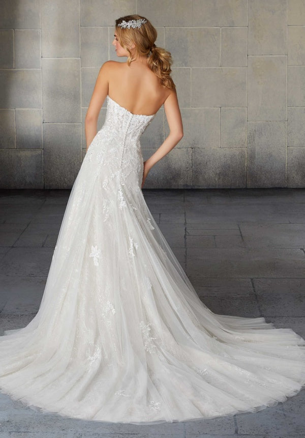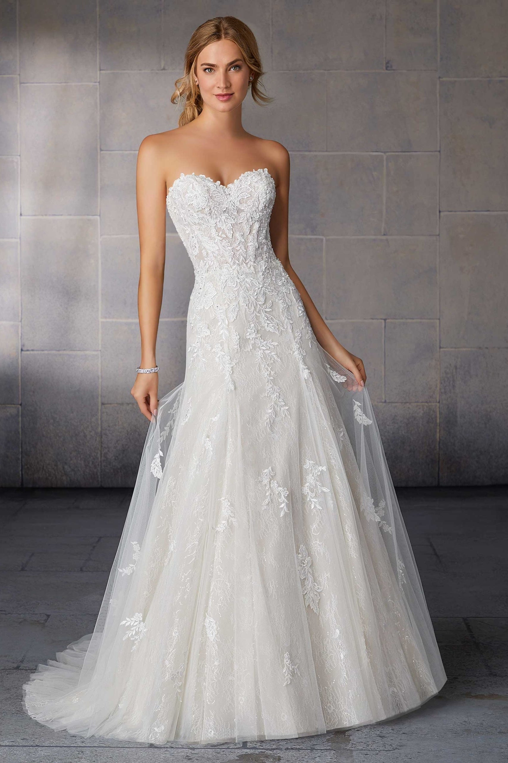 Introducing Shelly, a fashionable slim A-line gown crafted from delicate Chantilly lace. Featuring a flattering sweetheart neckline, this romantic and timeless design effortlessly combines elegance with modern sophistication, perfect for your unforgettable wedding day.