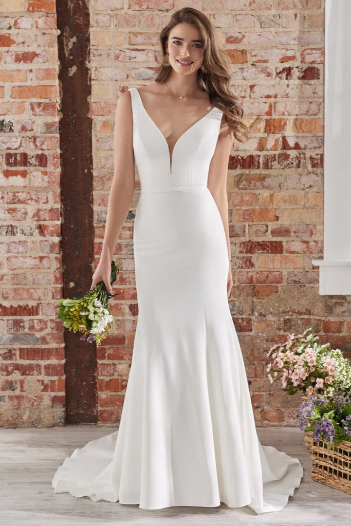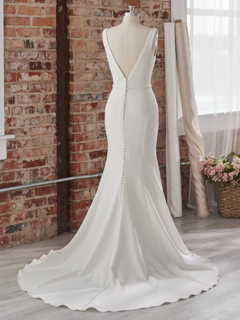 Theodora is a modern wedding gown crafted from luxurious crepe fabric that drapes beautifully for a flattering silhouette. Its timeless design combines contemporary elegance with classic charm, making it the perfect choice for brides seeking a stylish yet enduring look on their special day.