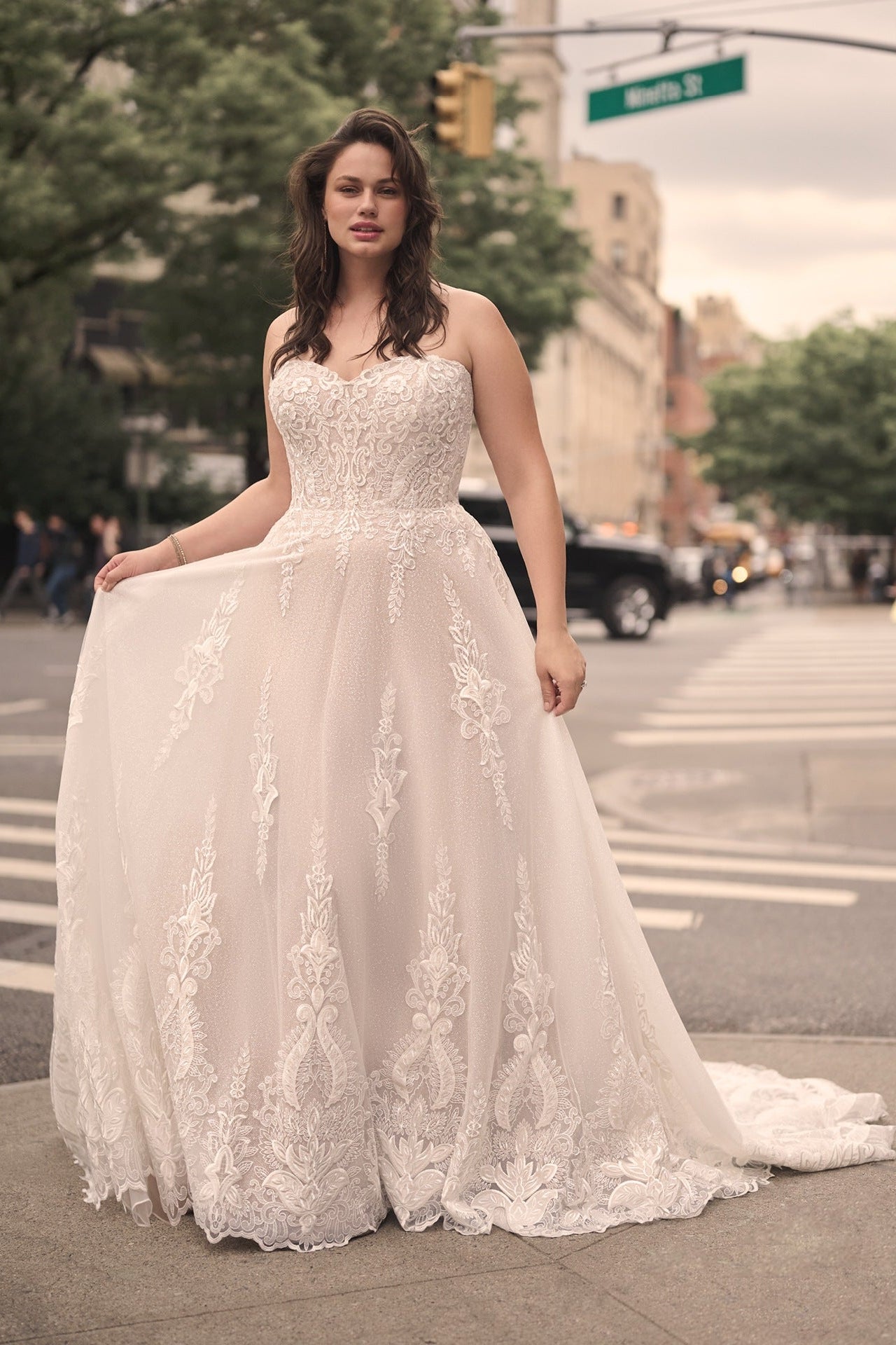 Introducing Ulanda, an enchanting A-line wedding gown that captures timeless elegance. Crafted in luxurious ivory, this stunning dress features shimmering aurora glitter that catches the light with every movement, creating a magical sparkle as you walk down the aisle. The showstopping detailed lace train adds drama and sophistication, trailing gracefully behind you for an unforgettable entrance. Perfect for the bride who desires both romance and radiance on her special day.
