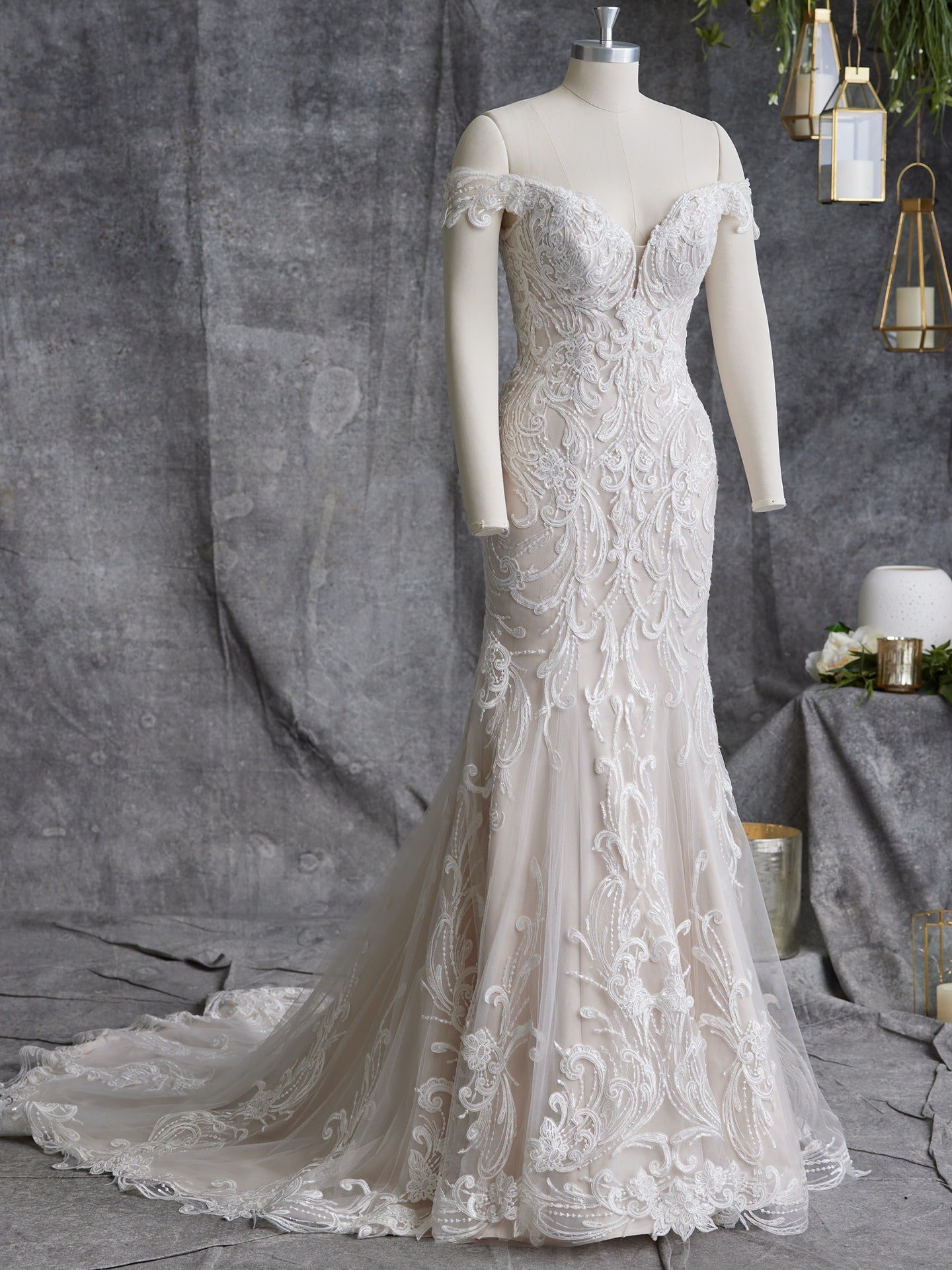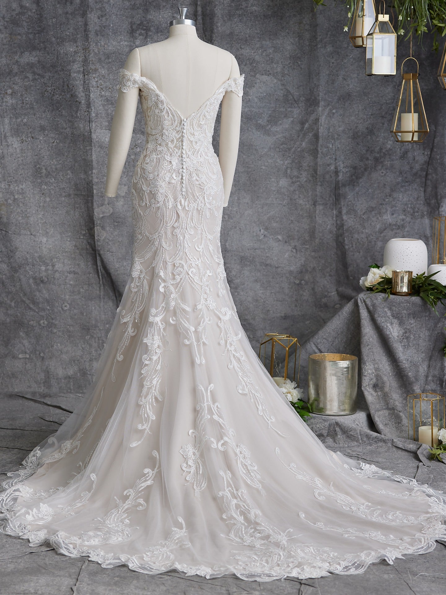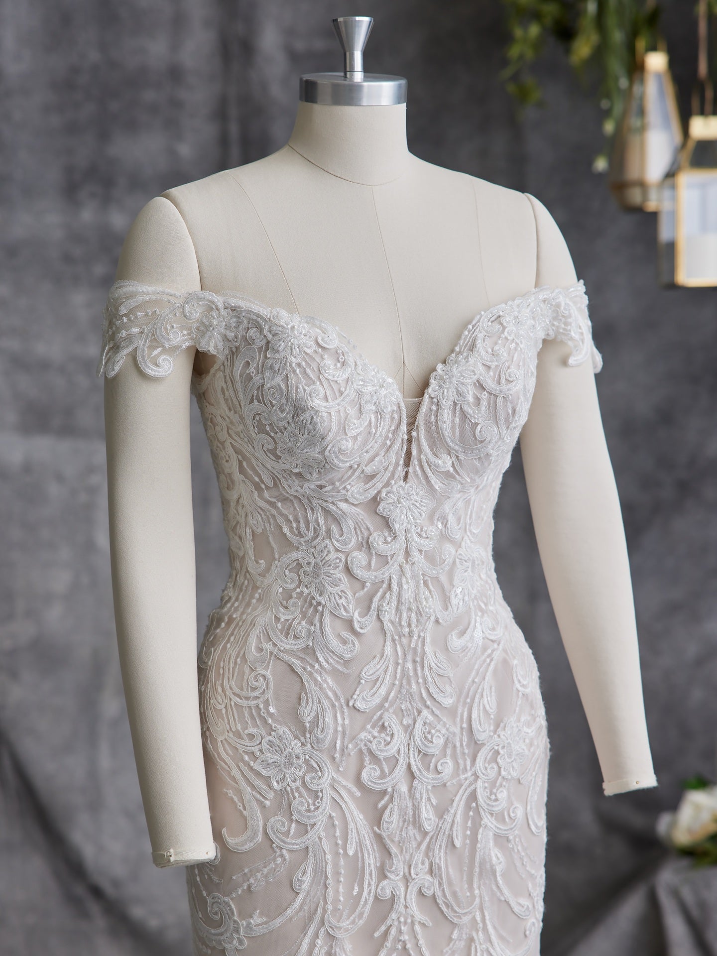 The Viola bridal dress features a sexy off-the-shoulder design that beautifully highlights the neckline and shoulders. Crafted with delicate lace detailing, it offers an elegant yet alluring look, perfect for brides seeking a timeless mix of romance and modern style. This dress enhances your natural grace while making a confident statement on your special day.